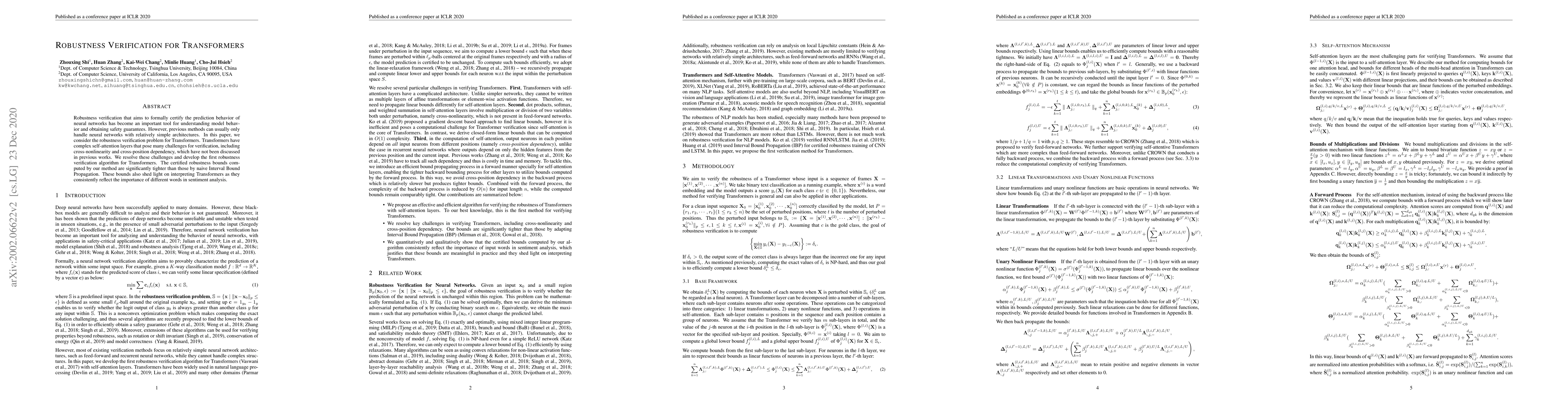 This paper presents the first robustness verification algorithm for Transformers, addressing their complex self-attention layers' challenges. The developed method computes tighter certified robustness bounds compared to naive approaches, providing insights into the importance of different words in sentiment analysis.