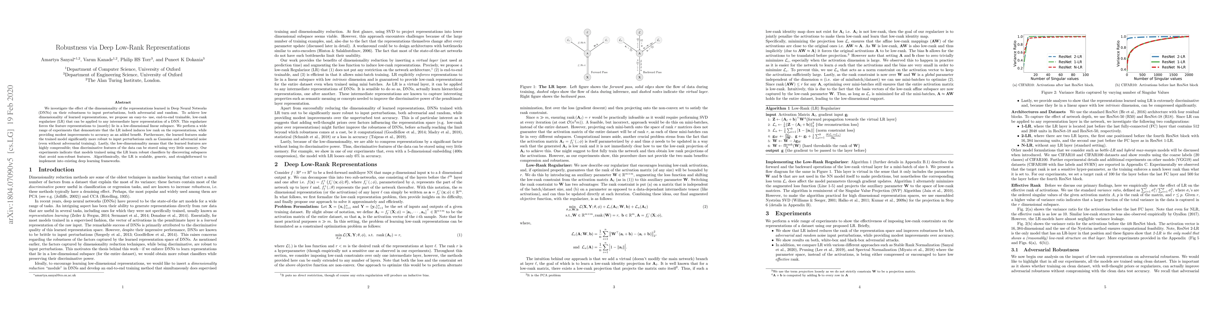 This paper proposes a low-rank regularizer to induce low-dimensionality in Deep Neural Networks, enhancing robustness to perturbations while modestly improving accuracy. The method significantly boosts resistance to both Gaussian and adversarial noise, and the resulting low-rank features are highly compressible.