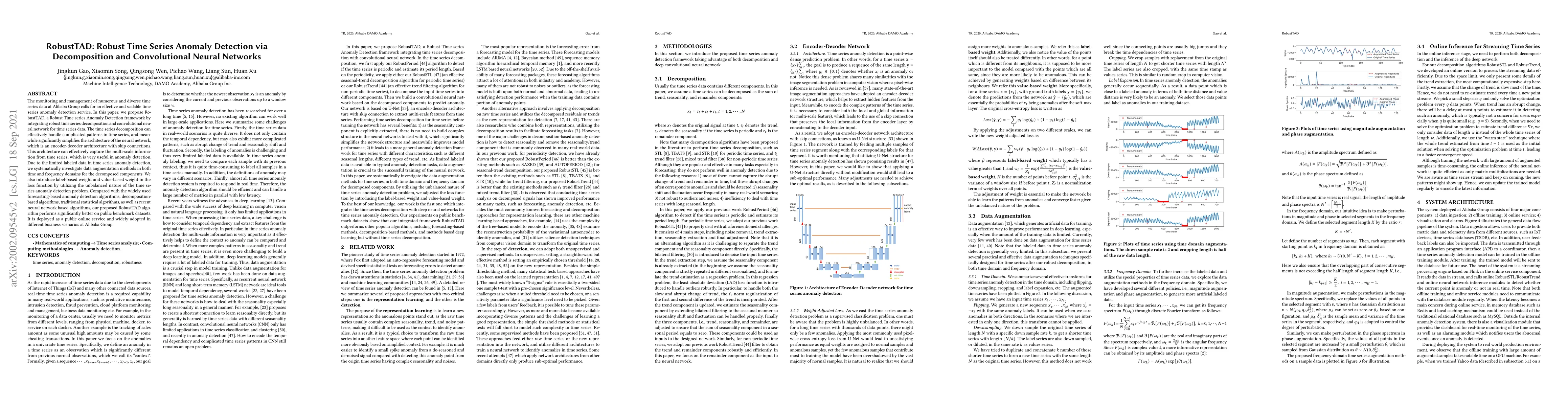 RobustTAD integrates robust seasonal-trend decomposition and convolutional neural networks for effective time series anomaly detection, simplifying neural network architecture and capturing multi-scale information. It outperforms other methods on benchmark datasets and is deployed at Alibaba Group.