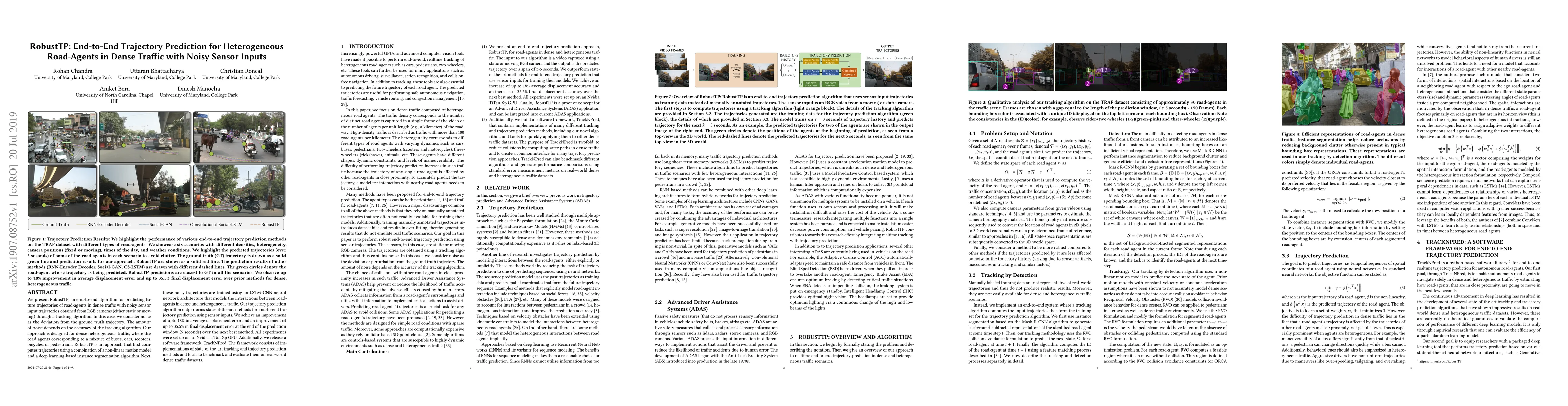 RobustTP is an end-to-end algorithm for predicting trajectories of diverse road agents in dense traffic using noisy sensor inputs from RGB cameras. It combines a non-linear motion model and deep learning for instance segmentation, followed by an LSTM-CNN neural network to model agent interactions, achieving superior performance with up to 18% improvement in average displacement error.