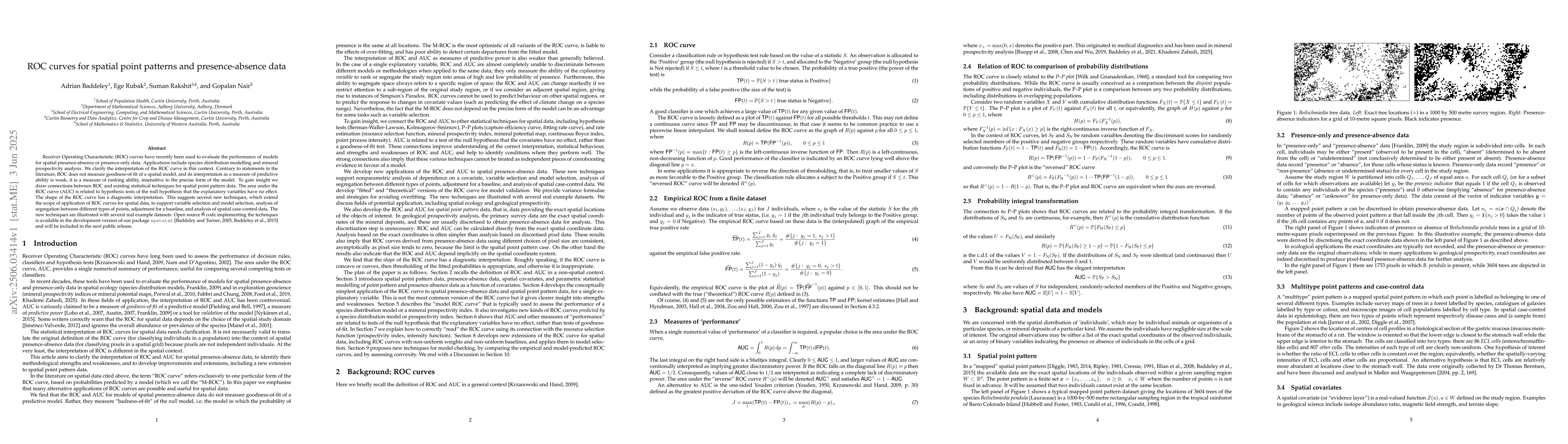 The paper clarifies the interpretation of ROC curves for spatial presence-absence or presence-only data, connecting ROC to existing statistical techniques for spatial point pattern data. It highlights that ROC measures ranking ability, relates AUC to hypothesis tests, and suggests new techniques for variable selection, model selection, and analyzing spatial case-control data.