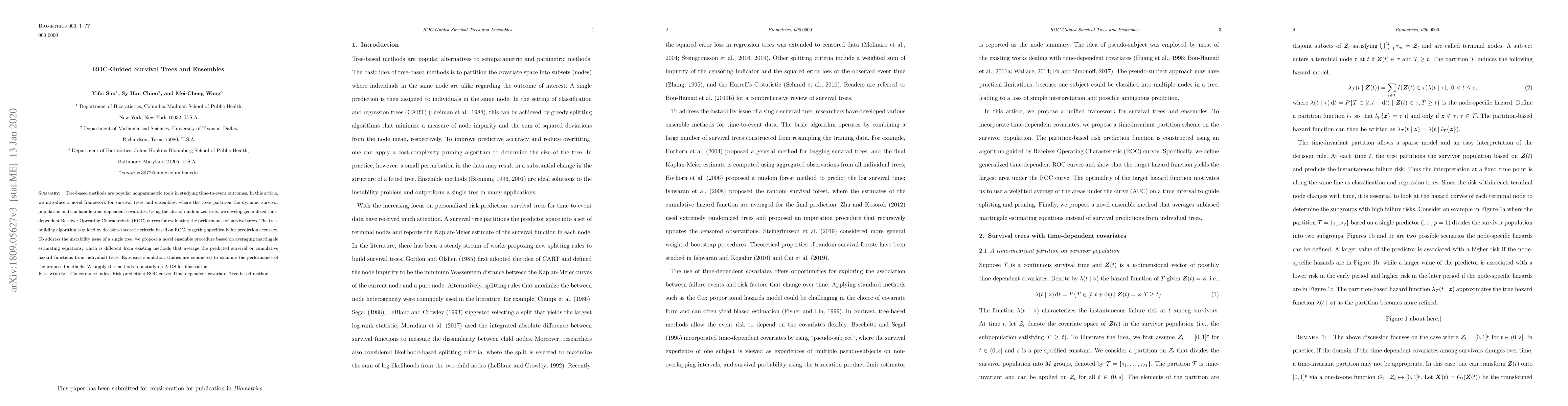 This paper presents a novel framework for survival trees and ensembles that utilize time-dependent covariates and ROC-guided randomized tests for performance evaluation. It proposes an ensemble method based on averaging martingale estimating equations, differing from traditional approaches, and demonstrates its effectiveness through simulations and an AIDS study application.