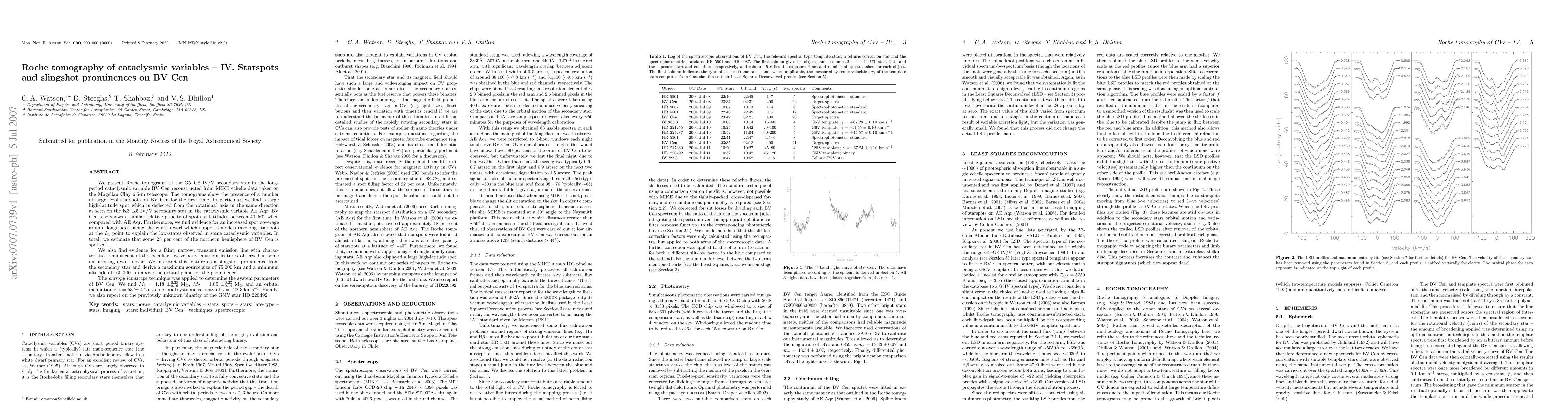 This paper provides Roche tomograms of the secondary star in the cataclysmic variable BV Cen, revealing numerous large, cool starspots, including a high-latitude spot deflected from the rotational axis. The study also identifies a slingshot prominence with a maximum size of 75,000 km and a minimum altitude of 160,000 km above the orbital plane.