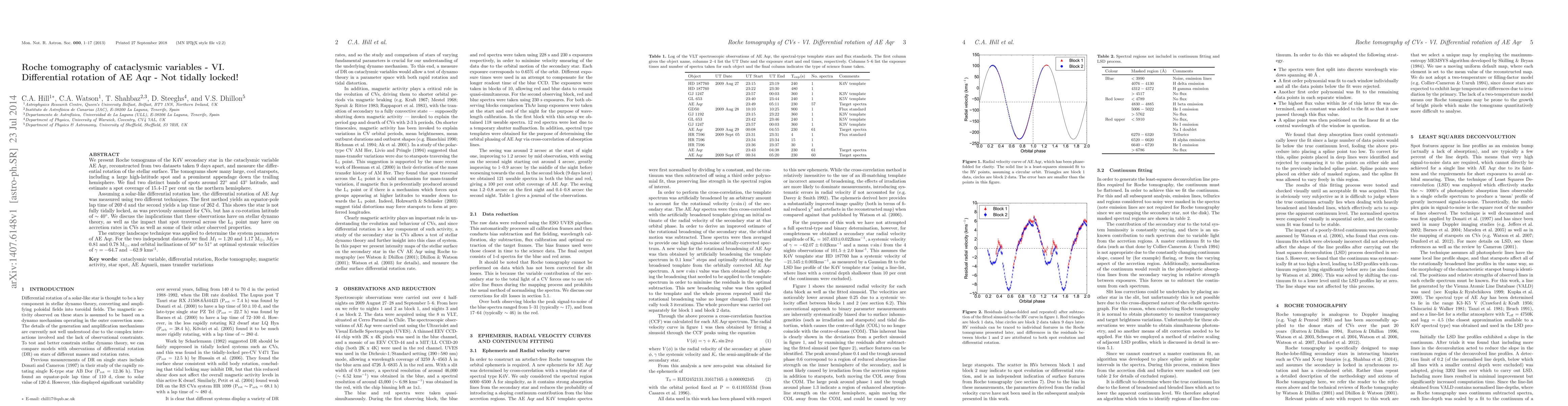 We present Roche tomograms of the K4V secondary star in the cataclysmic variable AE Aqr, reconstructed from two datasets taken 9 days apart, and measure the differential rotation of the stellar surface. The tomograms show many large, cool starspots, including a large high-latitude spot and a prominent appendage down the trailing hemisphere. We find two distinct bands of spots around 22$^{\circ}$ and 43$^{\circ}$ latitude, and estimate a spot coverage of 15.4-17% on the northern hemisphere. Assuming a solar-like differential rotation law, the differential rotation of AE Aqr was measured using two different techniques. The first method yields an equator-pole lap time of 269 d and the second yields a lap time of 262 d. This shows the star is not fully tidally locked, as was previously assumed for CVs, but has a co-rotation latitude of $\sim 40^{\circ}$. We discuss the implications that these observations have on stellar dynamo theory, as well as the impact that spot traversal across the first Lagrangian point may have on accretion rates in CVs as well as some of their other observed properties. The entropy landscape technique was applied to determine the system parameters of AE Aqr. For the two independent datasets we find M$_1$ = 1.20 and 1.17 M$_{\odot}$, M$_2$ = 0.81 and 0.78 M$_{\odot}$, and orbital inclinations of $50^{\circ}$ to $51^{\circ}$ at optimal systemic velocities of {\gamma} = -64.7 and -62.9 kms$^{-1}$.