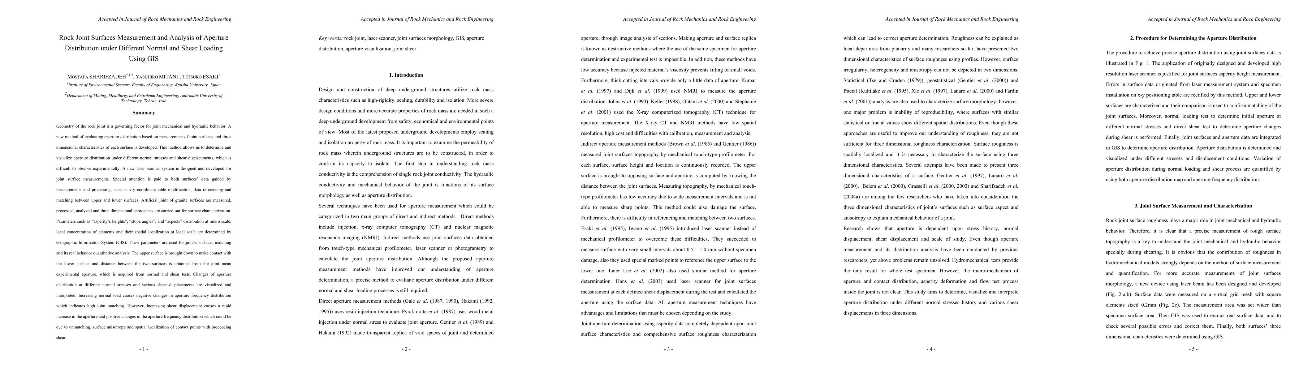 This research introduces a method using GIS to measure and analyze granite joint surfaces, examining how aperture distribution changes under varying normal and shear loads. Results show increased normal load reduces joint gaps (high matching), while increased shear displacement enlarges joint gaps (unmatching, anisotropy, and localized contact points).