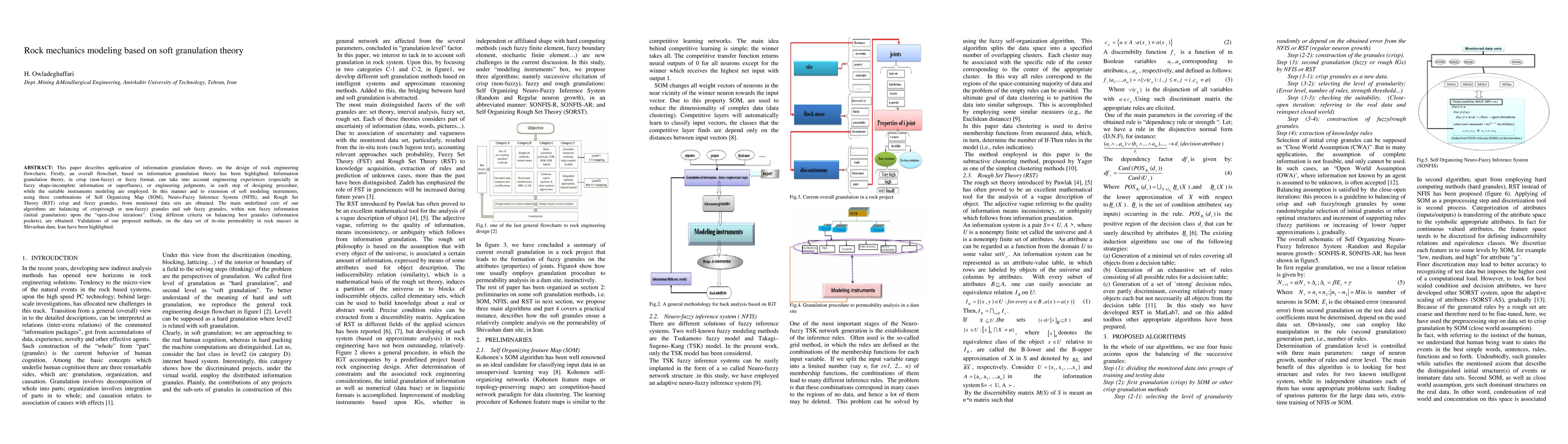 This paper describes application of information granulation theory, on the design of rock engineering flowcharts. Firstly, an overall flowchart, based on information granulation theory has been highlighted. Information granulation theory, in crisp (non-fuzzy) or fuzzy format, can take into account engineering experiences (especially in fuzzy shape-incomplete information or superfluous), or engineering judgments, in each step of designing procedure, while the suitable instruments modeling are employed. In this manner and to extension of soft modeling instruments, using three combinations of Self Organizing Map (SOM), Neuro-Fuzzy Inference System (NFIS), and Rough Set Theory (RST) crisp and fuzzy granules, from monitored data sets are obtained. The main underlined core of our algorithms are balancing of crisp(rough or non-fuzzy) granules and sub fuzzy granules, within non fuzzy information (initial granulation) upon the open-close iterations. Using different criteria on balancing best granules (information pockets), are obtained. Validations of our proposed methods, on the data set of in-situ permeability in rock masses in Shivashan dam, Iran have been highlighted.