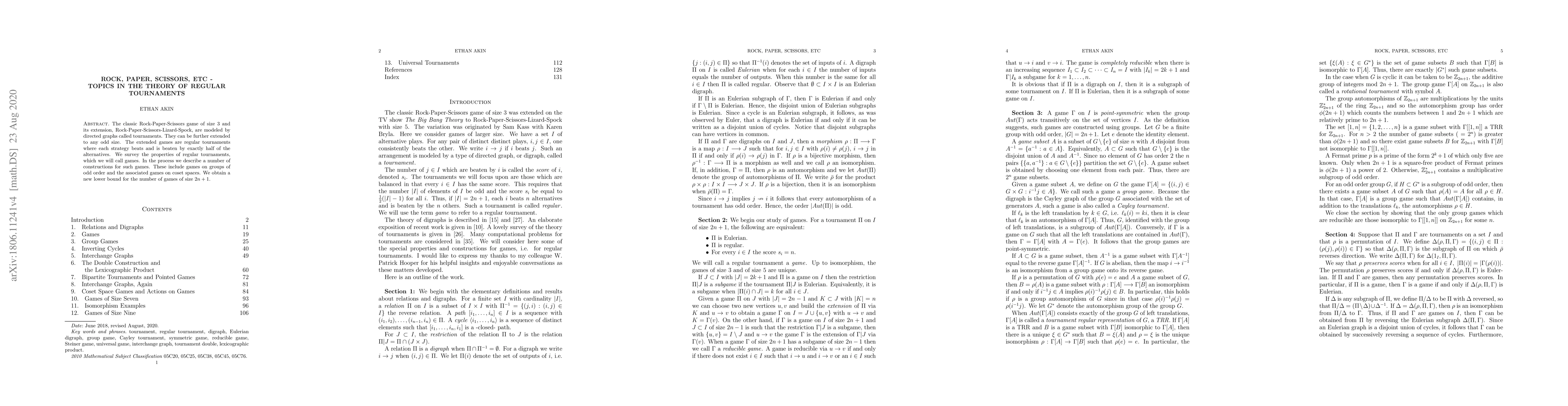 This paper surveys the properties of regular tournaments, modeled by the Rock-Paper-Scissors game and its extensions, where each strategy beats and loses to exactly half of the alternatives. It also presents constructions for such games, including those based on groups of odd order and coset spaces, and establishes a new lower bound for the number of games of size 2n+1.