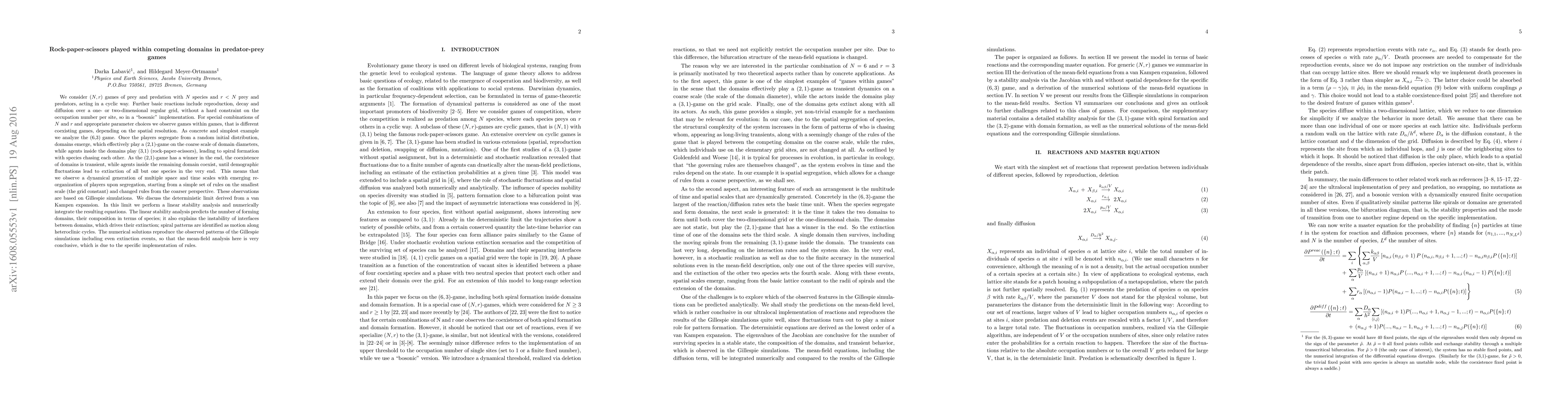 We consider (N,r) games of predation with N species and r < N prey and predators, acting in a cyclic way. Further basic reactions include reproduction, decay and diffusion over a regular grid, without a hard constraint on the occupation number per site, so in a "bosonic" implementation. For special combinations of N and r and appropriate parameter choices we observe games within games, that is, different coexisting games, depending on the spatial resolution. As concrete and simplest example we analyze the (6,3) game. Once the players segregate from a random initial distribution, domains emerge, which effectively play a (2,1)-game on the coarse scale of domain diameters, while agents inside the domains play (3,1) (rock-paper-scissors), leading to spiral formation with species chasing each other. As the (2,1)-game has a winner in the end, the coexistence of domains is transient, while agents inside the remaining domain coexist, until demographic fluctuations lead to extinction of all but one species in the very end. This means that we observe a dynamical generation of multiple space and time scales with emerging re-organization of players upon segregation, starting from a simple set of rules on the smallest scale and changed rules from the coarser perspective. These observations are based on Gillespie simulations. We discuss the deterministic limit derived from a van Kampen expansion. The linear stability analysis predicts the number of forming domains, their composition in terms of species; it also explains the instability of interfaces between domains, which drives their extinction; spiral patterns are identified as motion along heteroclinic cycles. The numerical solutions reproduce the observed patterns of the Gillespie simulations including even extinction events, so that the mean-field analysis here is very conclusive, which is due to the specific implementation of rules.