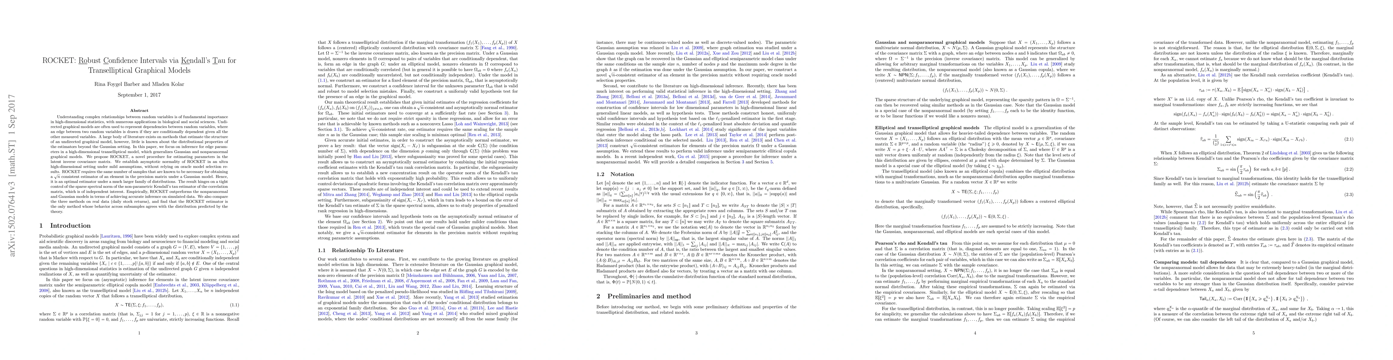 Undirected graphical models are used extensively in the biological and social sciences to encode a pattern of conditional independences between variables, where the absence of an edge between two nodes $a$ and $b$ indicates that the corresponding two variables $X_a$ and $X_b$ are believed to be conditionally independent, after controlling for all other measured variables. In the Gaussian case, conditional independence corresponds to a zero entry in the precision matrix $\Omega$ (the inverse of the covariance matrix $\Sigma$). Real data often exhibits heavy tail dependence between variables, which cannot be captured by the commonly-used Gaussian or nonparanormal (Gaussian copula) graphical models. In this paper, we study the transelliptical model, an elliptical copula model that generalizes Gaussian and nonparanormal models to a broader family of distributions. We propose the ROCKET method, which constructs an estimator of $\Omega_{ab}$ that we prove to be asymptotically normal under mild assumptions. Empirically, ROCKET outperforms the nonparanormal and Gaussian models in terms of achieving accurate inference on simulated data. We also compare the three methods on real data (daily stock returns), and find that the ROCKET estimator is the only method whose behavior across subsamples agrees with the distribution predicted by the theory.