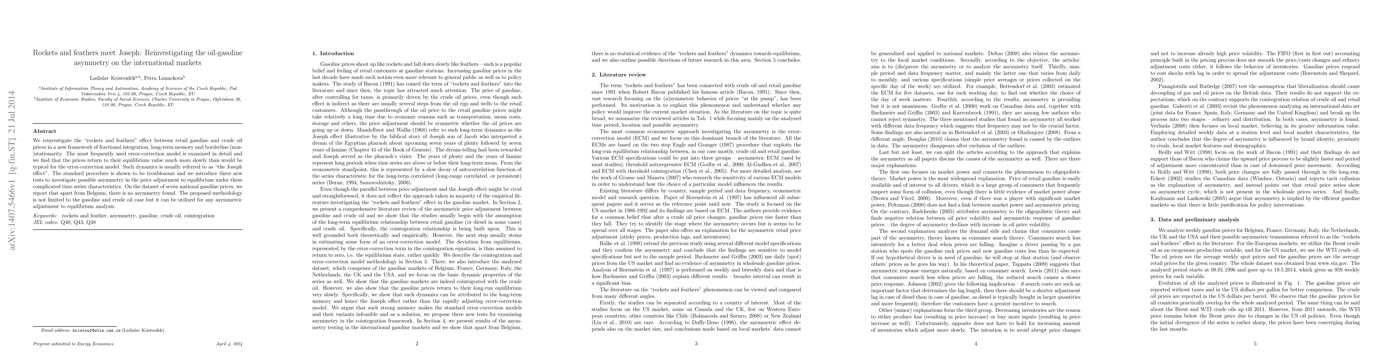 We reinvestigate the "rockets and feathers" effect between retail gasoline and crude oil prices in a new framework of fractional integration, long-term memory and borderline (non-)stationarity. The most frequently used error-correction model is examined in detail and we find that the prices return to their equilibrium value much more slowly than would be typical for the error-correction model. Such dynamics is usually referred to as "the Joseph effect". The standard procedure is shown to be troublesome and we introduce three new tests to investigate possible asymmetry in the price adjustment to equilibrium under these complicated time series characteristics. On the dataset of seven national gasoline prices, we report that apart from Belgium, there is no asymmetry found. The proposed methodology is not limited to the gasoline and crude oil case but it can be utilized for any asymmetric adjustment to equilibrium analysis.