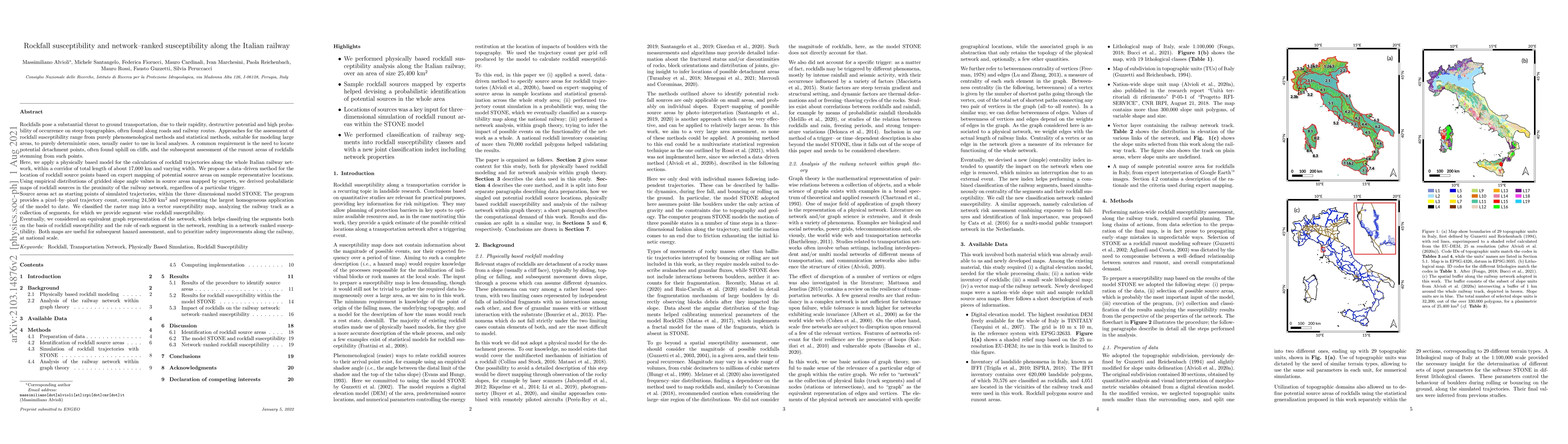 Rockfalls pose a substantial threat to ground transportation, due to their rapidity, destructive potential and high probability of occurrence on steep topographies, found along roads and railways. Approaches for assessment of rockfall susceptibility range from purely phenomenological methods and statistical methods, suitable for modeling large areas, to purely deterministic ones, usually easier to use in local analyses. A common requirement is the need to locate potential detachment points, often found uphill on cliffs, and the subsequent assessment of the runout areas of rockfalls stemming from such points. Here, we apply a physically based model to calculate rockfall trajectories along the whole Italian railway network, within a corridor of total length of about 17,000 km and varying width. We propose a data-driven method for the location of rockfall source points based on expert mapping of potential source areas on sample representative locations. Using empirical distributions of gridded slope values in source areas mapped by experts, we derived probabilistic maps of rockfall sources in the proximity of the railway network, regardless of a particular trigger. Source areas act as starting points of simulated trajectories in the three-dimensional model STONE. The program provides a pixel-by-pixel trajectory count, covering 24,500 km2, the largest homogeneous application of the model to date. We classified the map into a vector susceptibility map of the segments of the railway, for which we provide segment-wise rockfall susceptibility. Eventually, we considered a graph representation of the network to classify the segments both on the basis of rockfall susceptibility and the role of each segment in the network, resulting in a network-ranked susceptibility. Both maps are useful for subsequent hazard assessment, and to prioritize safety improvements along the railway, at national scale.