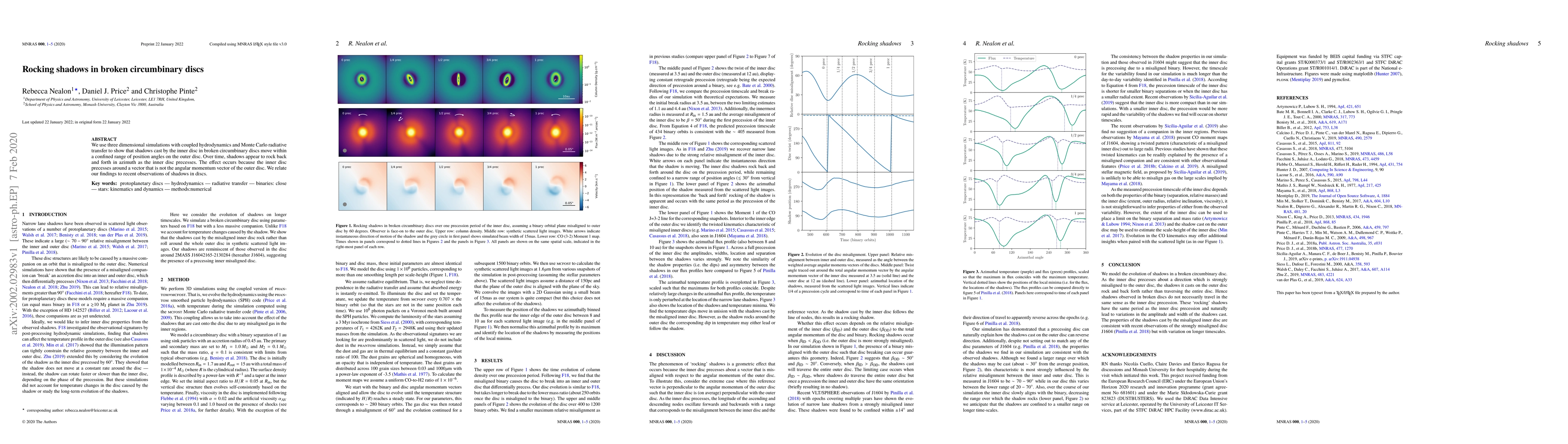 This paper demonstrates through simulations that shadows in broken circumbinary discs rock due to the inner disc's precession around a vector differing from the outer disc's angular momentum, leading to observable rocking shadows on the outer disc. The findings correlate with recent observational data of such dynamic shadow behaviors.