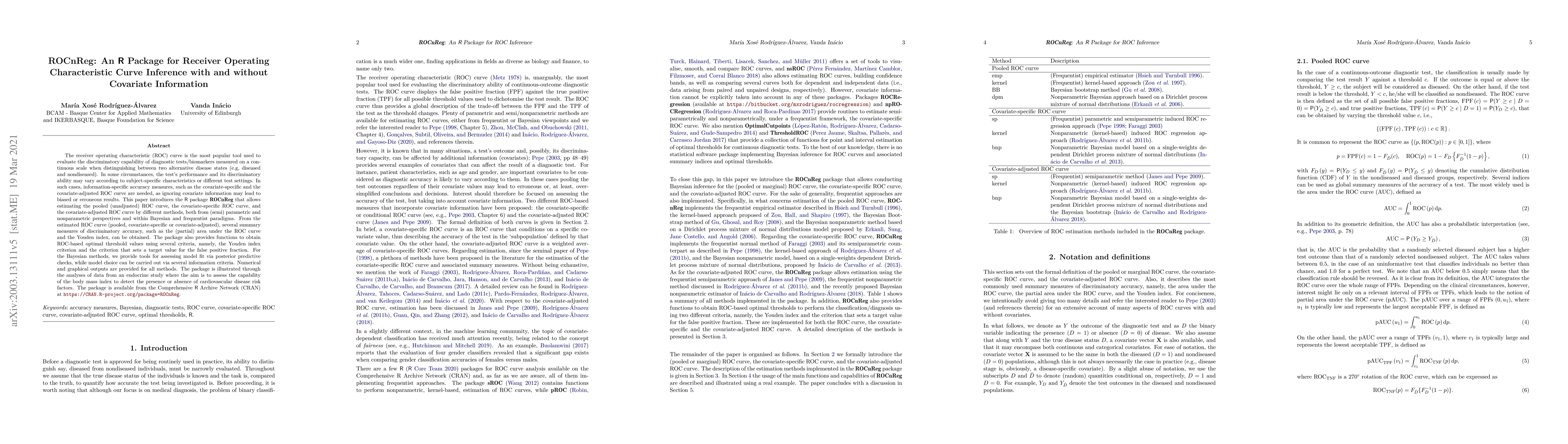 The R package ROCnReg facilitates the estimation of various types of ROC curves, including pooled, covariate-specific, and covariate-adjusted, to evaluate diagnostic test performance. It supports both parametric and nonparametric methods, as well as Bayesian and frequentist approaches, and provides tools for model fit assessment and optimal threshold determination.