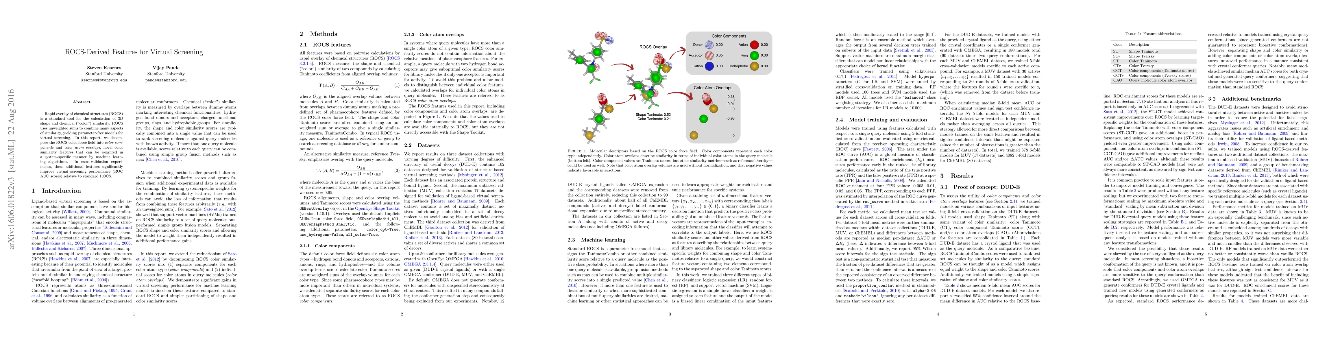 Rapid overlay of chemical structures (ROCS) is a standard tool for the calculation of 3D shape and chemical ("color") similarity. ROCS uses unweighted sums to combine many aspects of similarity, yielding parameter-free models for virtual screening. In this report, we decompose the ROCS color force field into "color components" and "color atom overlaps", novel color similarity features that can be weighted in a system-specific manner by machine learning algorithms. In cross-validation experiments, these additional features significantly improve virtual screening performance (ROC AUC scores) relative to standard ROCS.