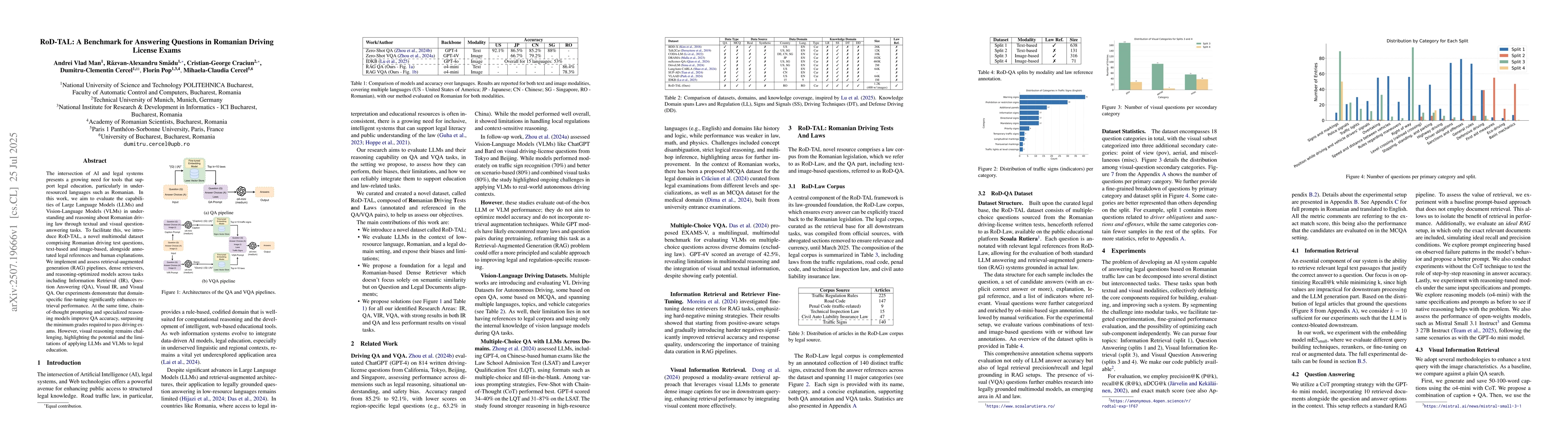 The intersection of AI and legal systems presents a growing need for tools that support legal education, particularly in under-resourced languages such as Romanian. In this work, we aim to evaluate the capabilities of Large Language Models (LLMs) and Vision-Language Models (VLMs) in understanding and reasoning about Romanian driving law through textual and visual question-answering tasks. To facilitate this, we introduce RoD-TAL, a novel multimodal dataset comprising Romanian driving test questions, text-based and image-based, alongside annotated legal references and human explanations. We implement and assess retrieval-augmented generation (RAG) pipelines, dense retrievers, and reasoning-optimized models across tasks including Information Retrieval (IR), Question Answering (QA), Visual IR, and Visual QA. Our experiments demonstrate that domain-specific fine-tuning significantly enhances retrieval performance. At the same time, chain-of-thought prompting and specialized reasoning models improve QA accuracy, surpassing the minimum grades required to pass driving exams. However, visual reasoning remains challenging, highlighting the potential and the limitations of applying LLMs and VLMs to legal education.