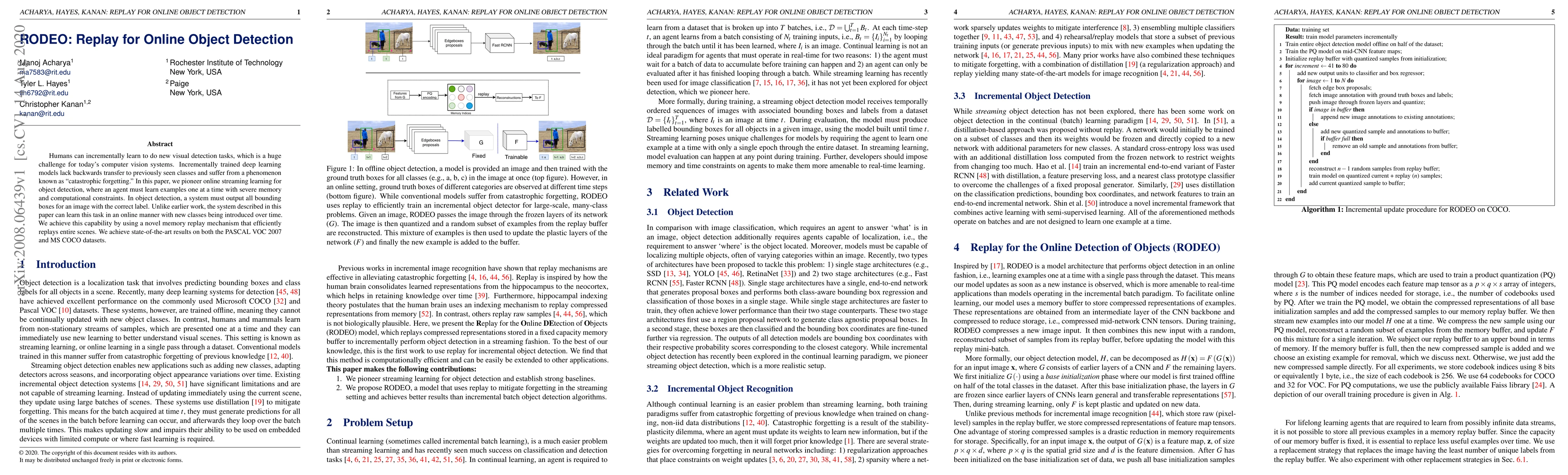 Humans can incrementally learn to do new visual detection tasks, which is a huge challenge for today's computer vision systems. Incrementally trained deep learning models lack backwards transfer to previously seen classes and suffer from a phenomenon known as $"catastrophic forgetting."$ In this paper, we pioneer online streaming learning for object detection, where an agent must learn examples one at a time with severe memory and computational constraints. In object detection, a system must output all bounding boxes for an image with the correct label. Unlike earlier work, the system described in this paper can learn this task in an online manner with new classes being introduced over time. We achieve this capability by using a novel memory replay mechanism that efficiently replays entire scenes. We achieve state-of-the-art results on both the PASCAL VOC 2007 and MS COCO datasets.