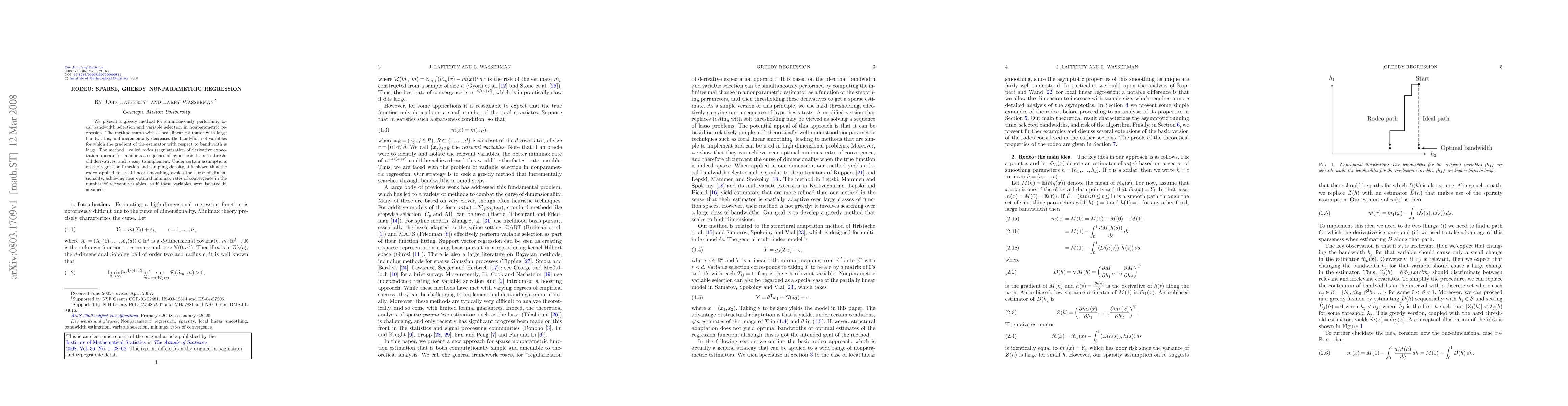 Title: Rodeo: Sparse, greedy nonparametric regression Summary: The paper introduces "Rodeo," a method for sparse, greedy nonparametric regression that combines local bandwidth selection and variable selection. It iteratively refines bandwidths based on estimator gradients, achieving near-optimal convergence rates while avoiding the curse of dimensionality.