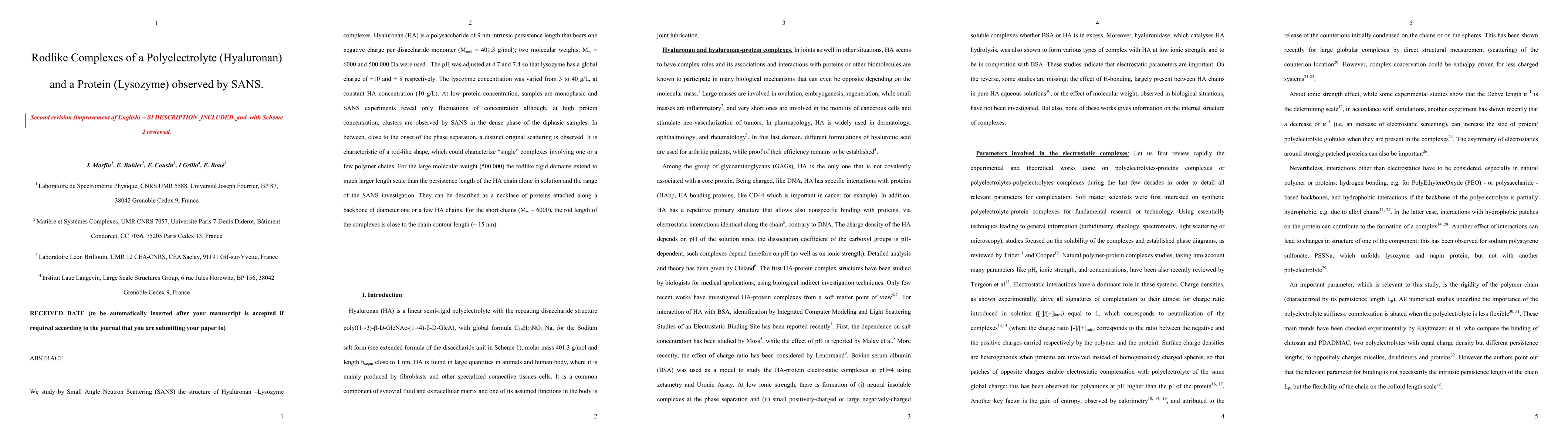 This study uses Small Angle Neutron Scattering (SANS) to investigate the structure of hyaluronan-lysozyme complexes, revealing rod-like complexes at high protein concentrations, particularly for large hyaluronan molecular weights, suggesting a necklace-like arrangement of proteins along the polymer backbone.