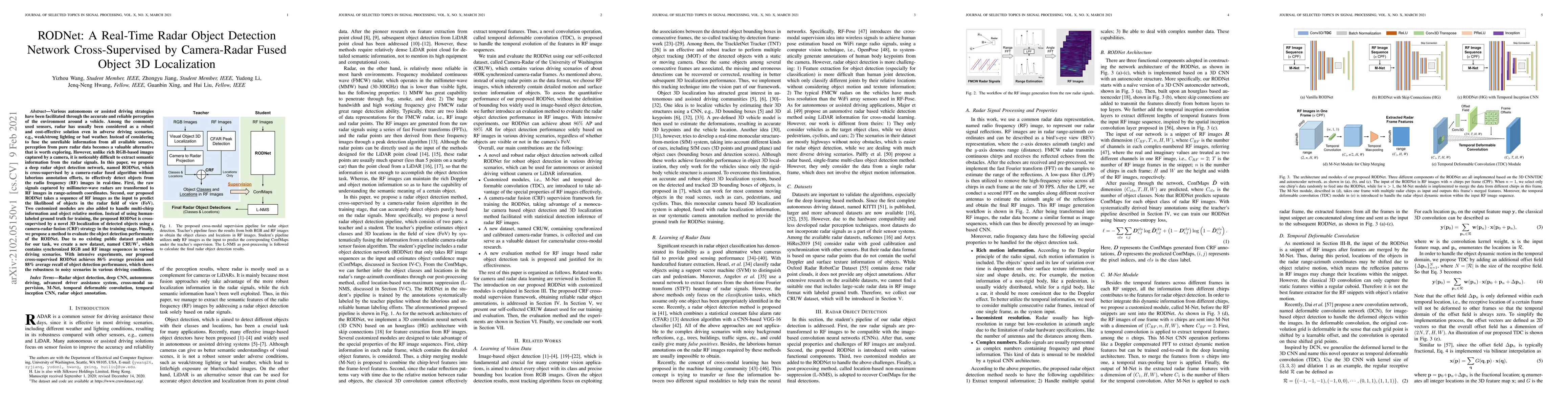 RODNet is a real-time radar object detection network cross-supervised by camera-radar fused 3D localization, designed to detect objects from radar images without relying on laboriously annotated data. The network achieves high detection precision and recall, demonstrating robustness in various driving scenarios.
