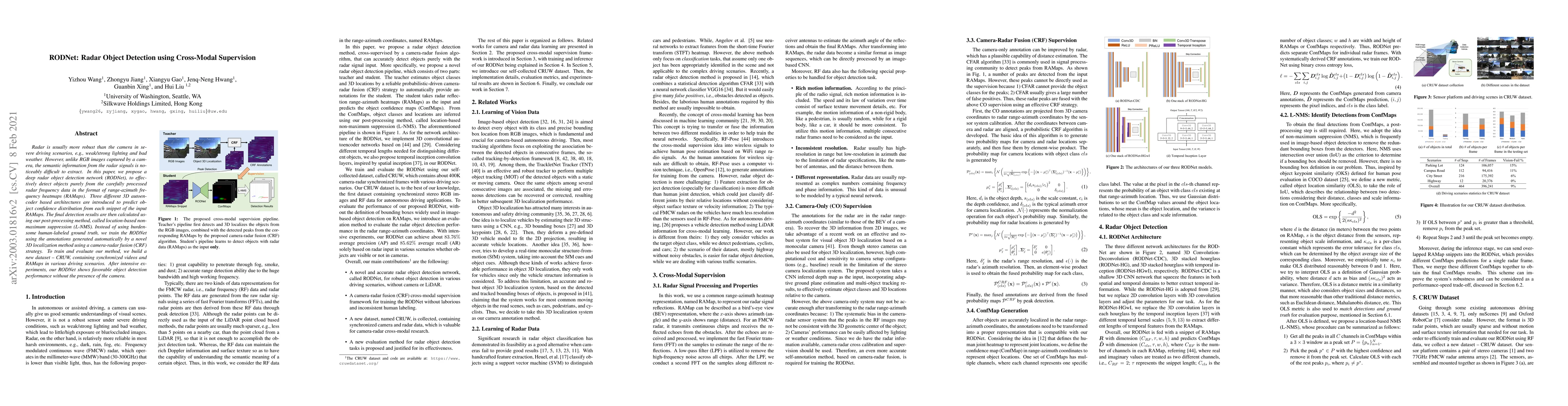RODNet is a deep radar object detection network that leverages cross-modal supervision from camera-radar fusion to detect objects from radar frequency data. The method achieves robust performance in adverse driving conditions without relying on human-labeled ground truth.