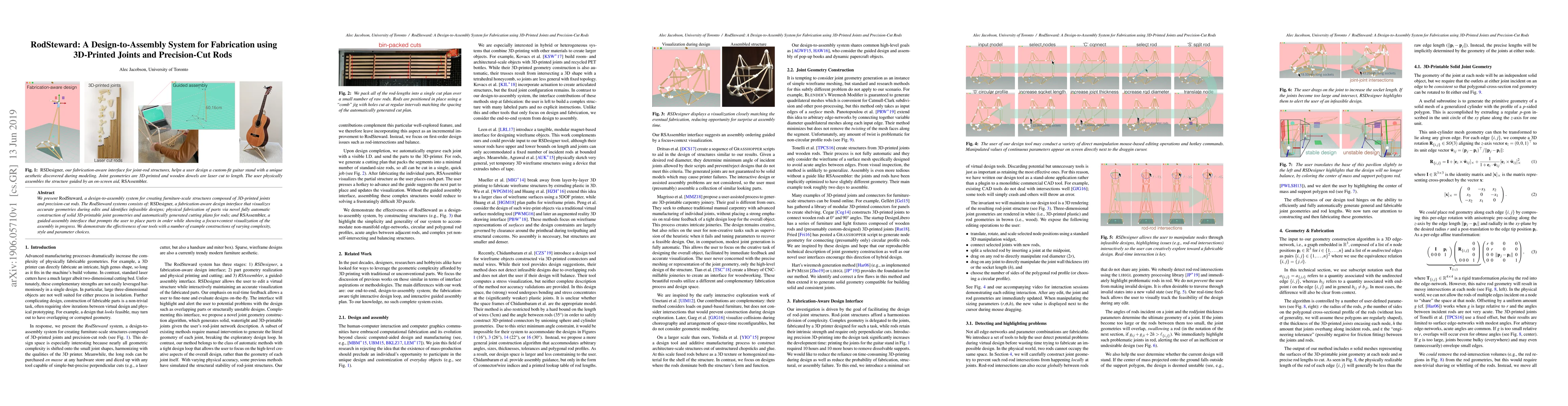 RodSteward is a design-to-assembly system for creating furniture-scale structures using 3D-printed joints and precision-cut rods, featuring RSDesigner for visualization, automatic fabrication, and RSAssembler for guided assembly. The system demonstrates effectiveness through various complex constructions.