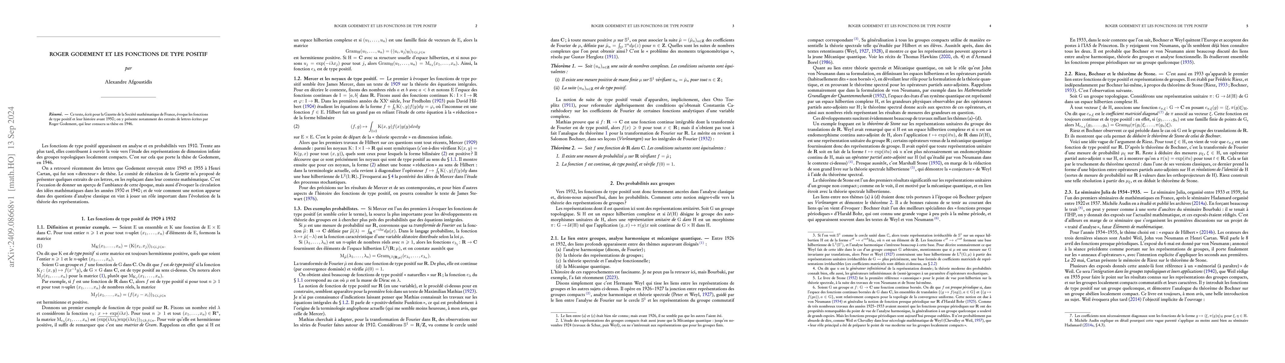 Ce texte, \'ecrit pour la Gazette de la Soci\'et\'e math\'ematique de France, \'evoque les fonctions de type positif et leur histoire avant 1950 ; on y pr\'esente notamment des extraits de lettres \'ecrites par Roger Godement, qui leur consacra sa th\`ese en 1946. This is an expository paper on the early history of positive-definite functions, written for the "Gazette de la Soci\'et\'e Math\'ematique de France". It contains pictures of letters written by Roger Godement, during and after the preparation of his 1946 thesis about positive-definite functions on groups.