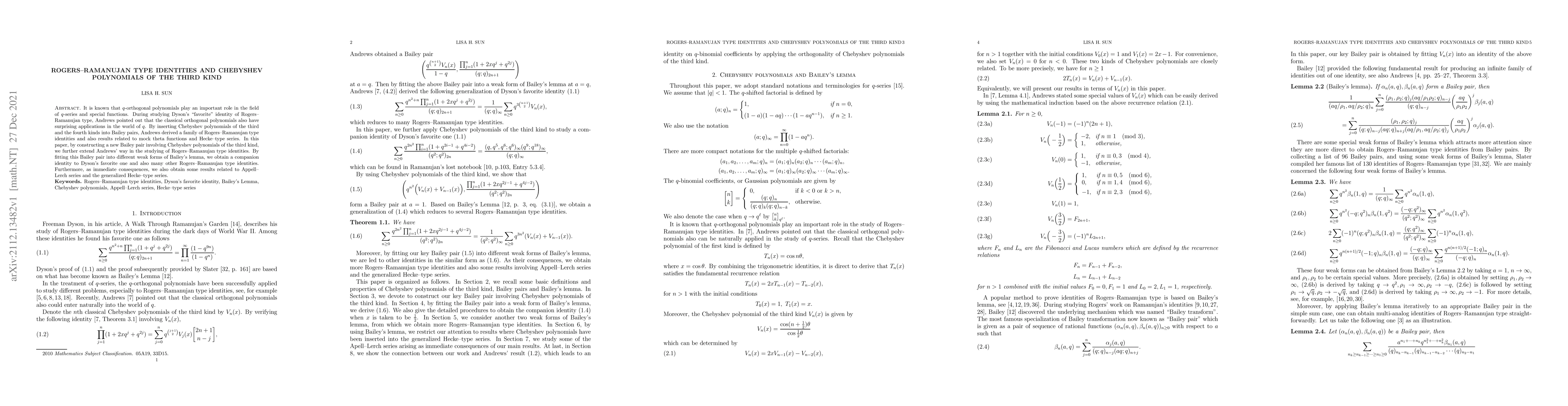 This paper extends Andrews' derivation of Rogers-Ramanujan type identities using Chebyshev polynomials of the third kind in a new Bailey pair. The results include companion identities to Dyson's favorite identity and connections to Appell-Lerch series and generalized Hecke-type series.