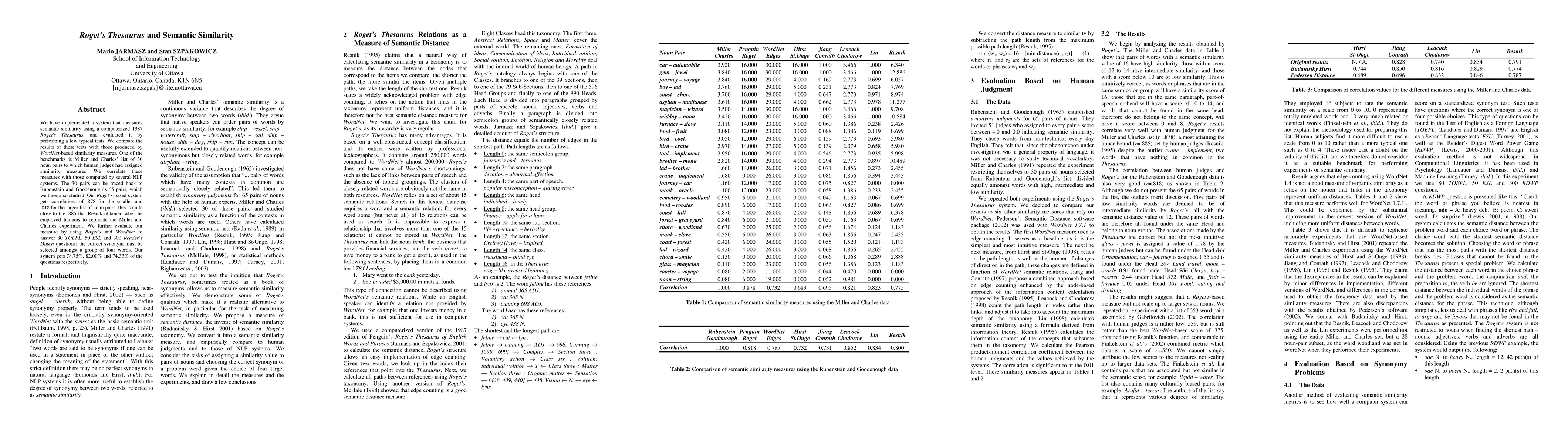 This paper implements a semantic similarity system using a computerized 1987 Roget's Thesaurus and evaluates it against WordNet-based measures, achieving high correlation with human judgments on noun pair similarity and good performance on synonym selection questions.