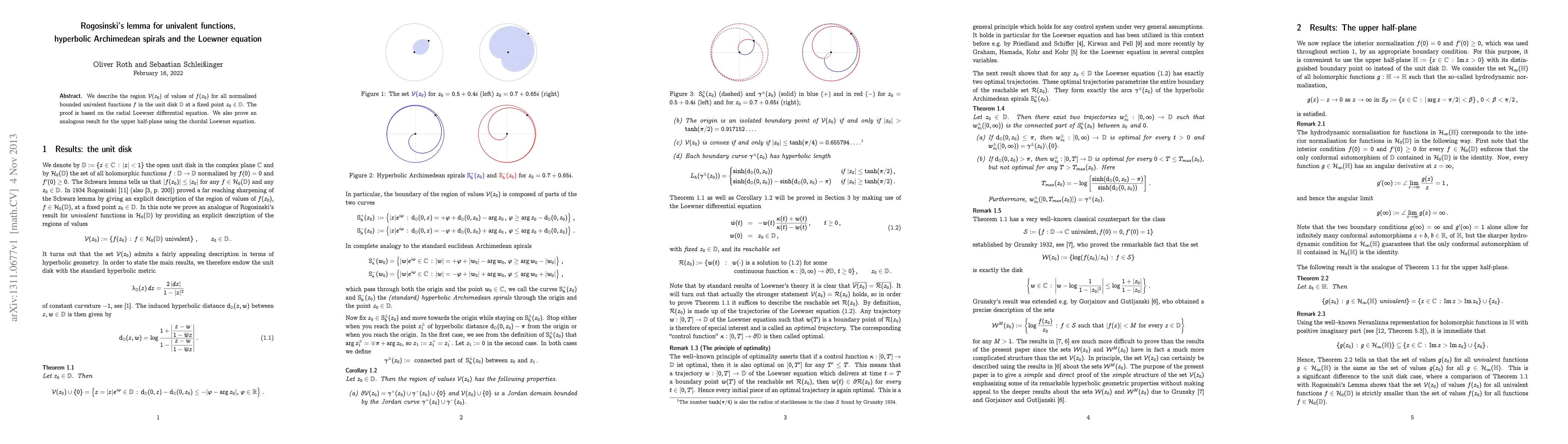 Summary: This paper explores the region of values for normalized univalent functions at a fixed point in the unit disk, linking it to the radial Loewner equation, and extends the result to the upper half-plane using the chordal Loewner equation. The proof leverages Rogosinski's lemma and hyperbolic spirals.