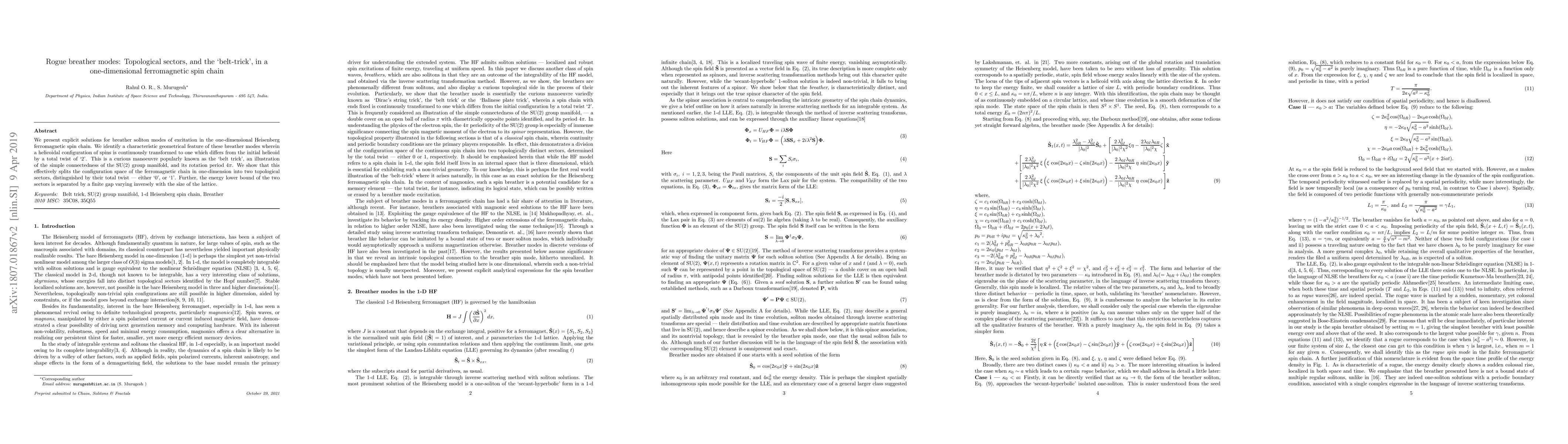 We present explicit solutions for breather soliton modes of excitation in the one-dimensional Heisenberg ferromagnetic spin chain. We identify a characteristic geometrical feature of these breather modes wherein a helicoidal configuration of spins is continuously transformed to one which differs from the initial helicoid by a total twist of `2'. This is a curious manoeuvre popularly known as the `belt trick', an illustration of the simple connectedness of the $\rm{SU}(2)$ group manifold, and its rotation period $4\pi$. We show that this effectively splits the configuration space of the ferromagnetic chain in one-dimension into two topological sectors, distinguished by their total twist -- either `0', or `1'. Further, the energy lower bound of the two sectors is separated by a finite gap varying inversely with the size of the lattice.