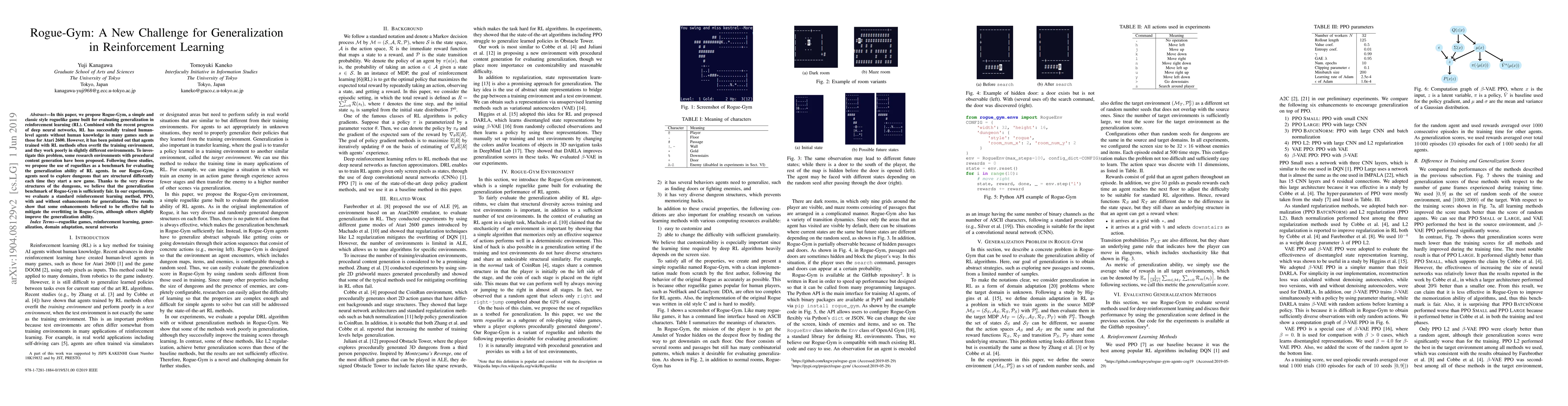 Rogue-Gym, a customizable roguelike game environment for evaluating generalization in reinforcement learning, along with an extensive analysis of various generalization methods using PPO as the baseline.