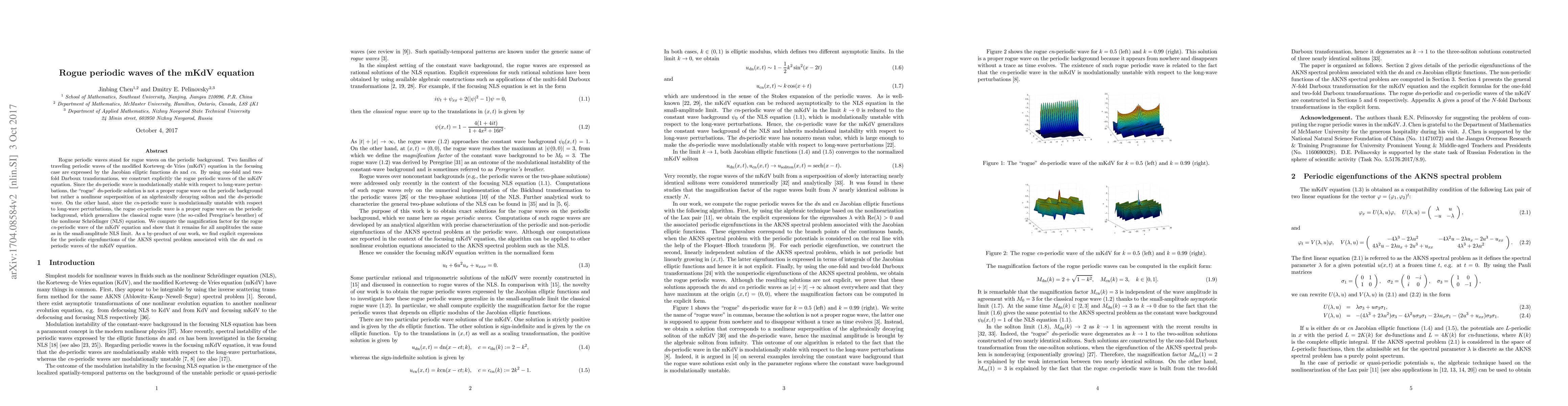 This paper constructs rogue periodic waves of the mKdV equation using Darboux transformations, expressing them via Jacobian elliptic functions and computing their magnification factors. The study reveals the propagation of solitons over modulationally stable periodic waves and the modulation instability leading to rogue waves.