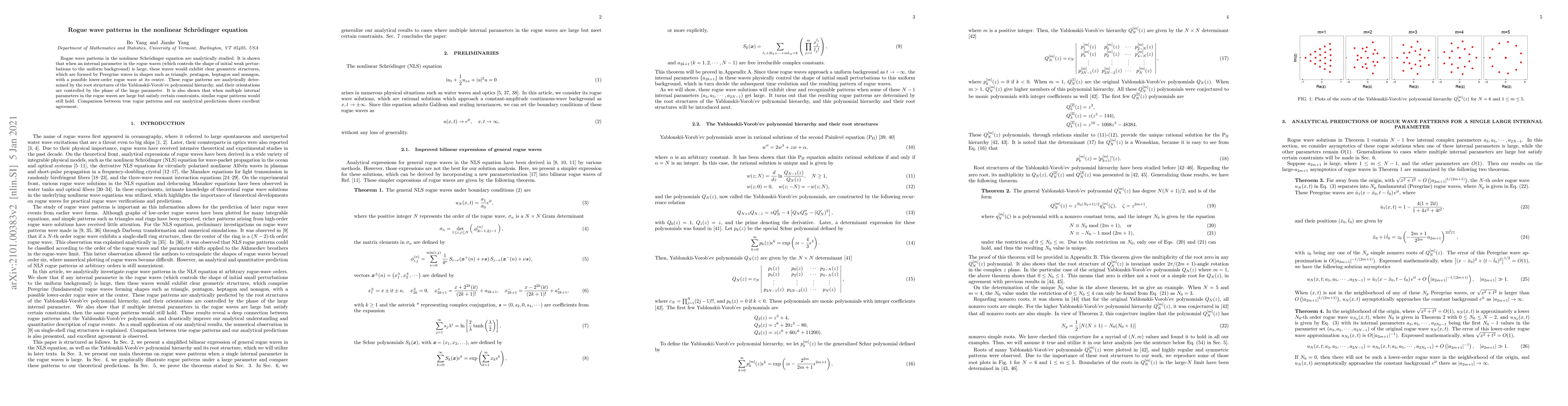This paper analytically investigates rogue wave patterns in the nonlinear Schrödinger equation, revealing that large internal parameters lead to geometric structures like triangles, pentagons, and heptagons formed by Peregrine waves, with root structures determined by the Yablonskii-Vorob'ev polynomial hierarchy. The study also demonstrates that similar patterns persist under certain constraints on multiple parameters, with analytical predictions matching observed rogue waves closely.