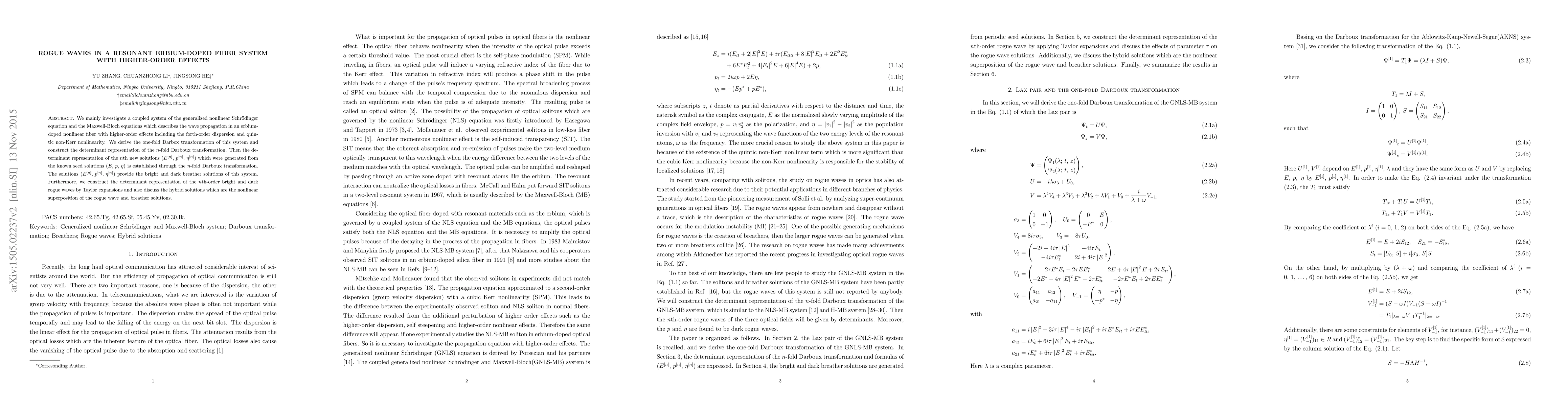 We mainly investigate a coupled system of the generalized nonlinear Schr\"odinger equation and the Maxwell-Bloch equations which describes the wave propagation in an erbium-doped nonlinear fiber with higher-order effects including the forth-order dispersion and quintic non-Kerr nonlinearity. We derive the one-fold Darbox transformation of this system and construct the determinant representation of the $n$-fold Darboux transformation. Then the determinant representation of the $n$th new solutions $(E^{[n]},\, p^{[n]},\, \eta^{[n]})$ which were generated from the known seed solutions $(E, \, p, \, \eta)$ is established through the $n$-fold Darboux transformation. The solutions $(E^{[n]},\, p^{[n]},\, \eta^{[n]})$ provide the bright and dark breather solutions of this system. Furthermore, we construct the determinant representation of the $n$th-order bright and dark rogue waves by Taylor expansions and also discuss the hybrid solutions which are the nonlinear superposition of the rogue wave and breather solutions.