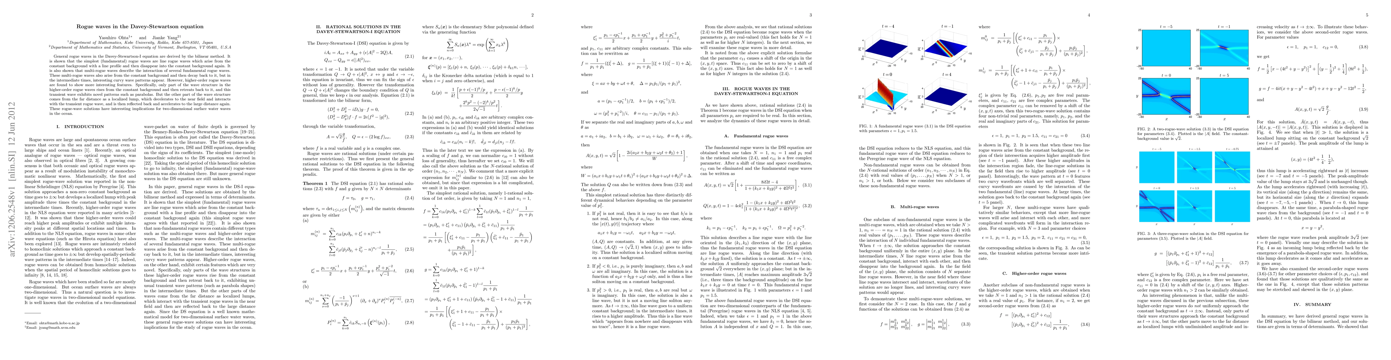 This paper derives general rogue waves in the Davey-Stewartson-I equation using the bilinear method, showing that fundamental rogue waves emerge from and return to a constant background, while multi-rogue waves exhibit complex curvy patterns. Higher-order rogue waves feature novel transient patterns and localized lumps that interact and reflect, with implications for two-dimensional ocean surface waves.