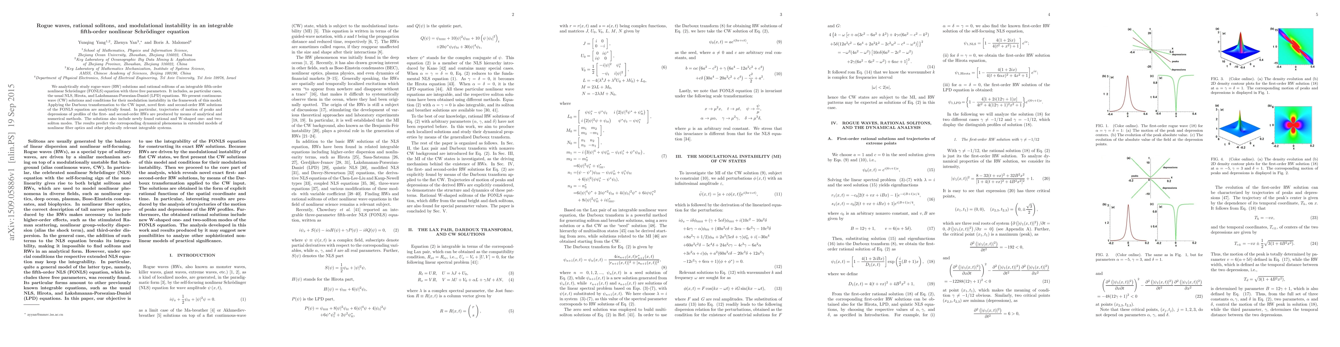 We analytically study rogue-wave (RW) solutions and rational solitons of an integrable fifth-order nonlinear Schr\"odinger (FONLS) equation with three free parameters. It includes, as particular cases, the usual NLS, Hirota, and Lakshmanan-Porsezian-Daniel (LPD) equations. We present continuous-wave (CW) solutions and conditions for their modulation instability in the framework of this model. Applying the Darboux transformation to the CW input, novel first- and second-order RW solutions of the FONLS equation are analytically found. In particular, trajectories of motion of peaks and depressions of profiles of the first- and second-order RWs are produced by means of analytical and numerical methods. The solutions also include newly found rational and W-shaped one- and two-soliton modes. The results predict the corresponding dynamical phenomena in extended models of nonlinear fiber optics and other physically relevant integrable systems.