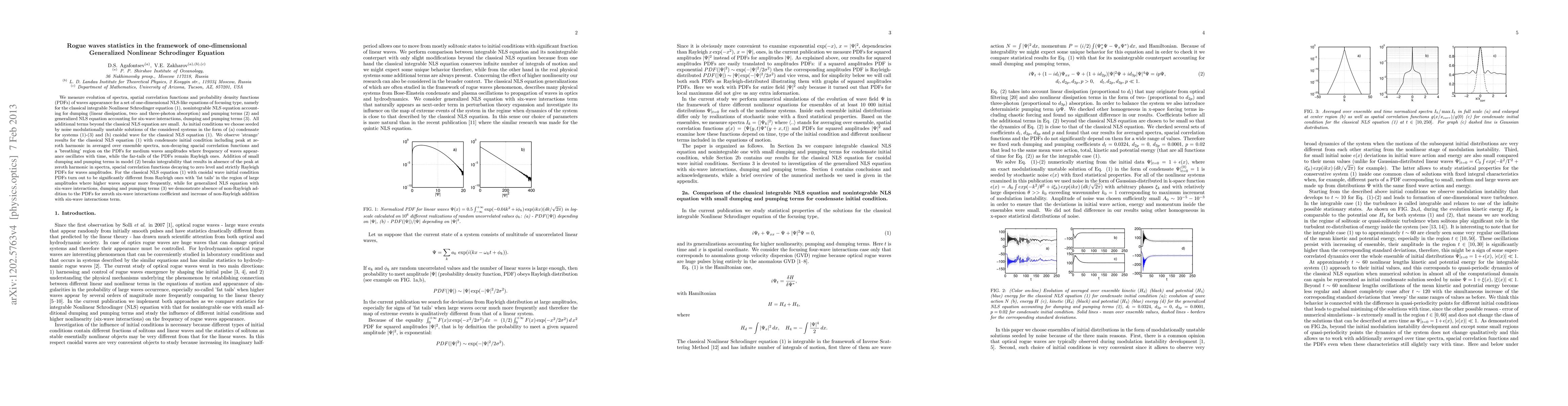 This study examines the behavior of rogue waves using one-dimensional Generalized Nonlinear Schrödinger Equations. It finds that classical NLS with condensate initial conditions exhibit unusual spectral peaks, non-decaying spatial correlations, and oscillating wave appearance frequency. Adding small dissipation and pumping terms to NLS breaks integrability, eliminating these anomalies. The research also shows that initial cnoidal wave conditions for classical NLS result in 'fat-tailed' PDFs for large amplitudes. For a generalized NLS incorporating six-wave interactions, dissipation, and pumping, non-Rayleigh additions to PDFs increase with the six-wave interaction term.