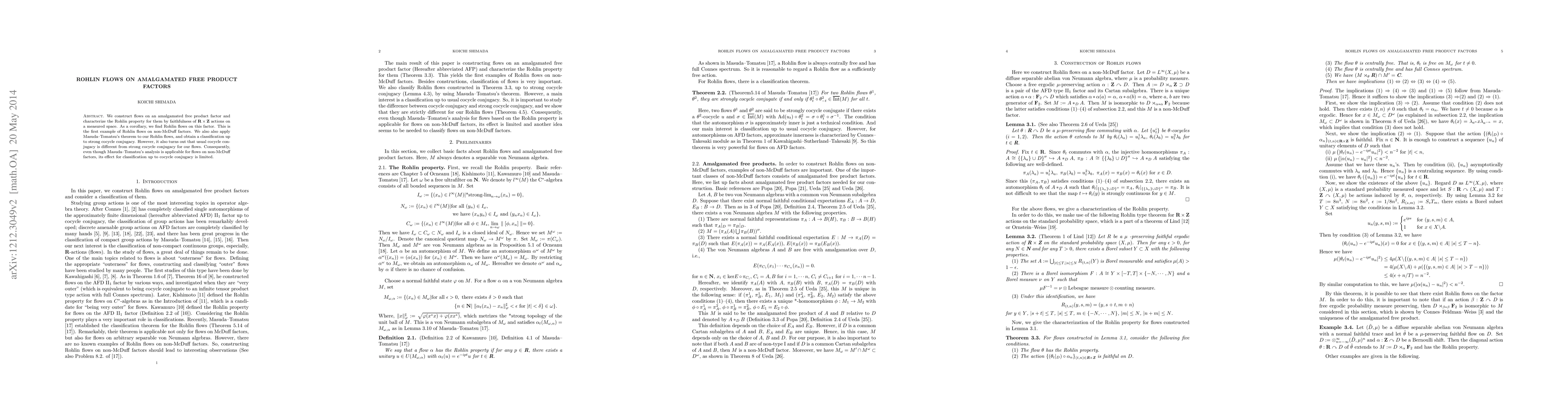 We construct flows on an amalgamated free product factor and characterize the Rohlin property for them by freeness of $\mathbf{R}\times \mathbf{Z}$ actions on a measured space. As a corolally, it turns out that there exist Rohlin flows on an amalgamated free product factor. This shows that the classification theorem of Masuda and Tomatsu for the Rohlin flows is also applicable to flows on non-McDuff factors.