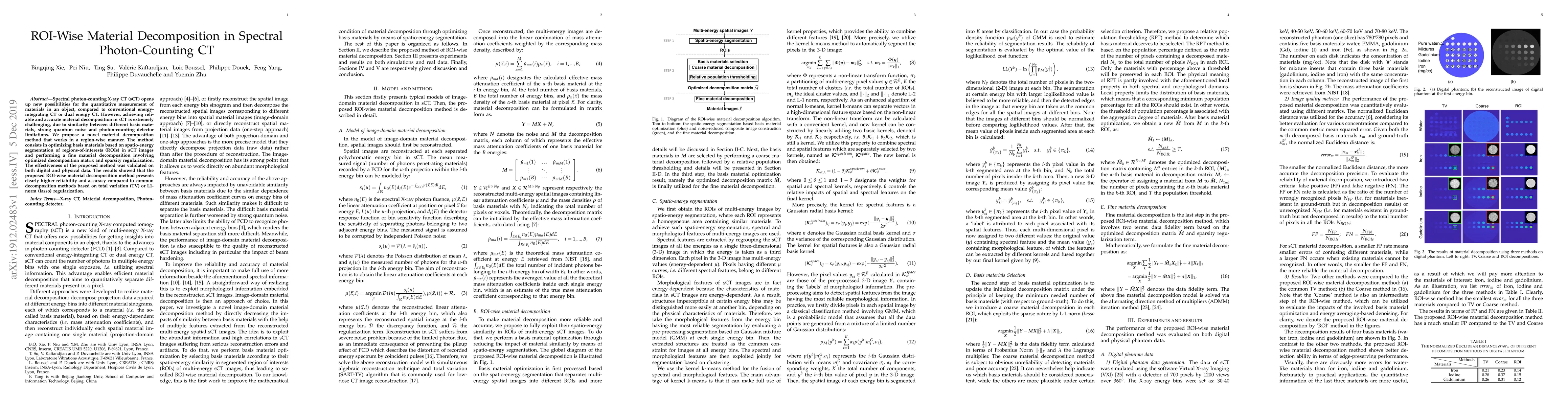 The research proposes a novel ROI-wise material decomposition method for spectral photon-counting CT (sCT) that optimizes basis materials using spatio-energy segmentation of regions-of-interest (ROIs) in sCT images, followed by fine material decomposition with an optimized decomposition matrix and sparsity regularization.