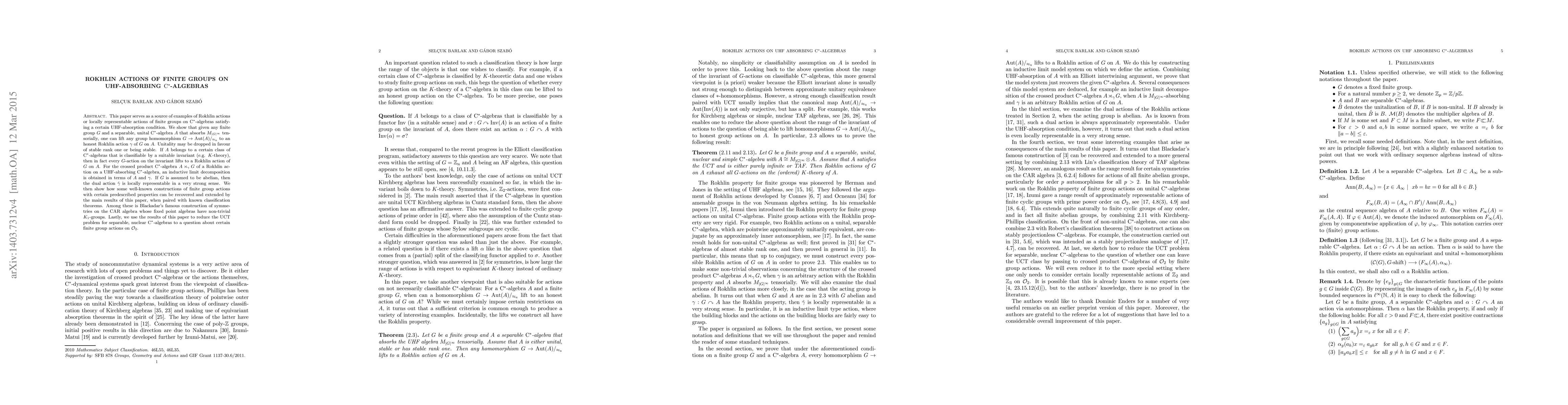 This paper constructs Rokhlin actions for finite groups on separable, unital C*-algebras that satisfy UHF-absorption conditions, lifting group homomorphisms to such actions. It shows that these actions can be extended under certain stable rank conditions and applies to classifiable C*-algebras.