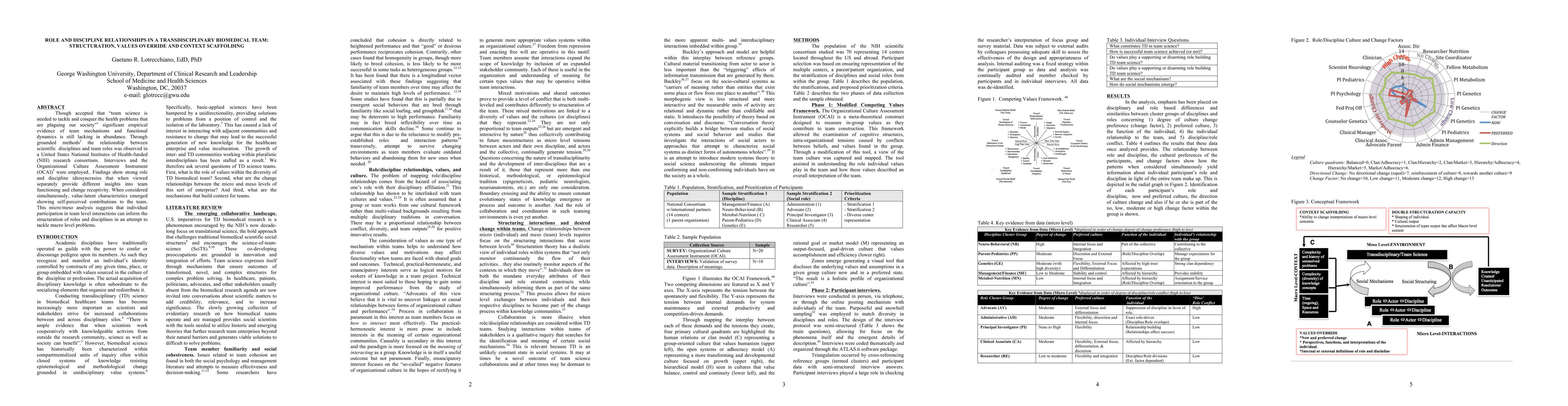 Though accepted that "team science" is needed to tackle and conquer the health problems that are plaguing our society significant empirical evidence of team mechanisms and functional dynamics is still lacking in abundance. Through grounded methods the relationship between scientific disciplines and team roles was observed in a United States National Institutes of Health-funded (NIH) research consortium. Interviews and the Organizational Culture Assessment Instrument (OCAI) were employed.. Findings show strong role and discipline idiosyncrasies that when viewed separately provide different insights into team functioning and change receptivity. When considered simultaneously, value-latent characteristics emerged showing self-perceived contributions to the team. This micro/meso analysis suggests that individual participation in team level interactions can inform the structuration of roles and disciplines in an attempt to tackle macro level problems.