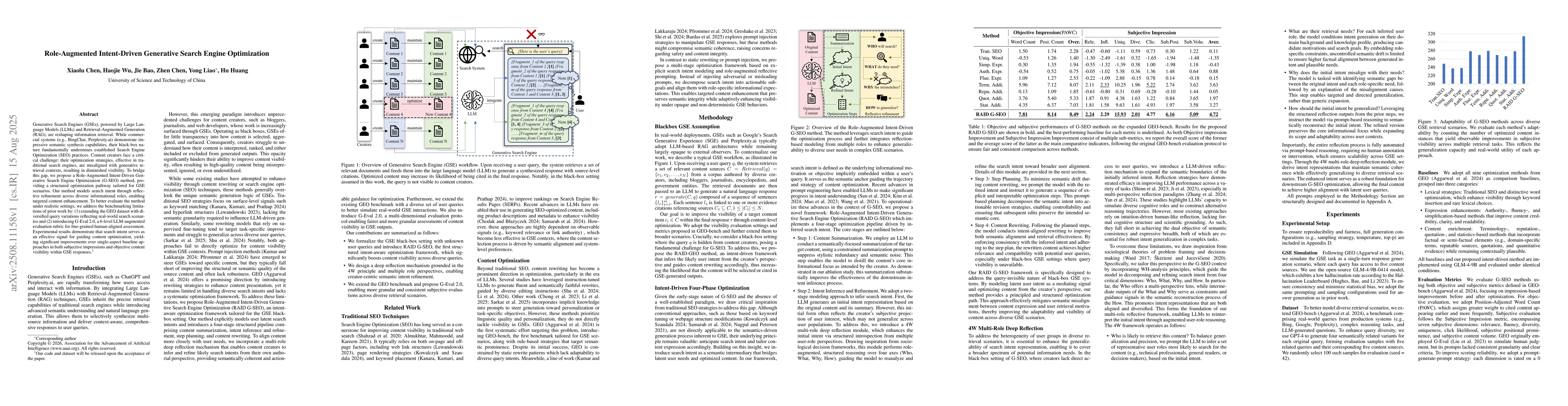Generative Search Engines (GSEs), powered by Large Language Models (LLMs) and Retrieval-Augmented Generation (RAG), are reshaping information retrieval. While commercial systems (e.g., BingChat, Perplexity.ai) demonstrate impressive semantic synthesis capabilities, their black-box nature fundamentally undermines established Search Engine Optimization (SEO) practices. Content creators face a critical challenge: their optimization strategies, effective in traditional search engines, are misaligned with generative retrieval contexts, resulting in diminished visibility. To bridge this gap, we propose a Role-Augmented Intent-Driven Generative Search Engine Optimization (G-SEO) method, providing a structured optimization pathway tailored for GSE scenarios. Our method models search intent through reflective refinement across diverse informational roles, enabling targeted content enhancement. To better evaluate the method under realistic settings, we address the benchmarking limitations of prior work by: (1) extending the GEO dataset with diversified query variations reflecting real-world search scenarios and (2) introducing G-Eval 2.0, a 6-level LLM-augmented evaluation rubric for fine-grained human-aligned assessment. Experimental results demonstrate that search intent serves as an effective signal for guiding content optimization, yielding significant improvements over single-aspect baseline approaches in both subjective impressions and objective content visibility within GSE responses.