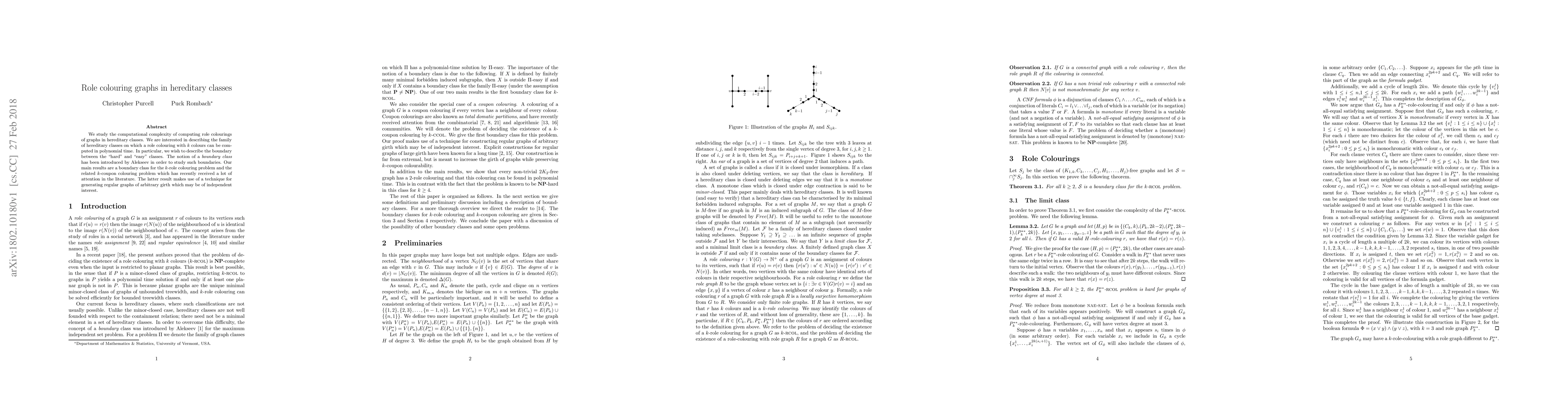 This paper investigates the computational complexity of role colourings in hereditary graph classes, identifying a boundary class where k-role colouring can be computed in polynomial time. It also introduces a technique for generating regular graphs of arbitrary girth, which may have broader applications.