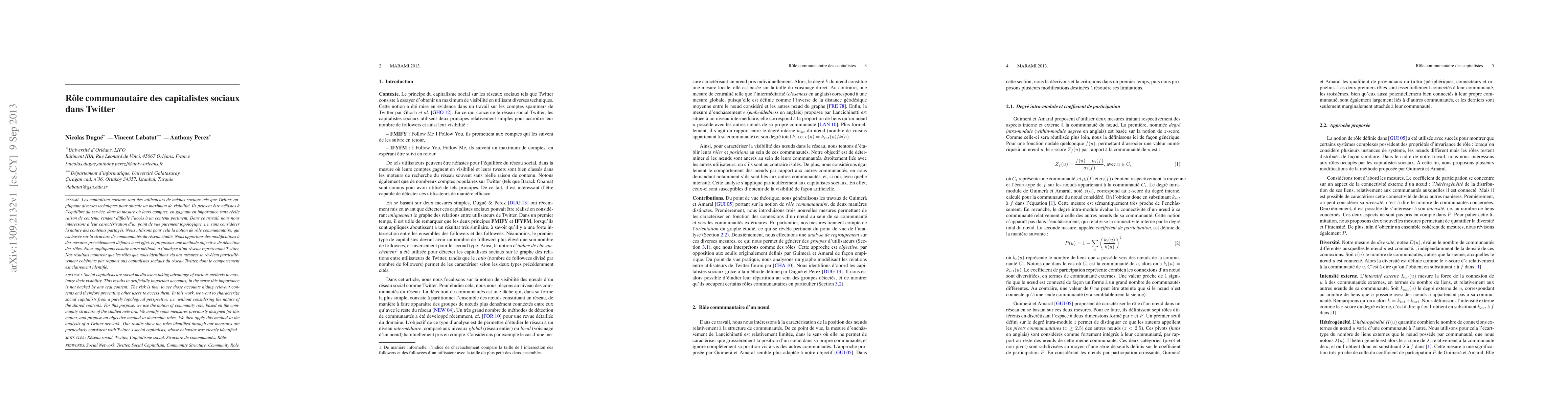 Les capitalistes sociaux sont des utilisateurs de m\'edias sociaux tels que Twitter, appliquant diverses techniques pour obtenir un maximum de visibilit\'e. Ils peuvent \^etre n\'efastes \`a l'\'equilibre du service, dans la mesure o\`u leurs comptes, en gagnant en importance sans r\'eelle raison de contenu, rendent difficile l'acc\`es \`a un contenu pertinent. Dans ce travail, nous nous int\'eressons \`a leur caract\'erisation d'un point de vue purement topologique, i.e. sans consid\'erer la nature des contenus partag\'es. Nous utilisons pour cela la notion de r\^ole communautaire, qui est bas\'ee sur la structure de communaut\'es du r\'eseau \'etudi\'e. Nous apportons des modifications \`a des mesures pr\'ec\'edemment d\'efinies \`a cet effet, et proposons une m\'ethode objective de d\'etection des r\^oles. Nous appliquons ensuite notre m\'ethode \`a l'analyse d'un r\'eseau repr\'esentant Twitter. Nos r\'esultats montrent que les r\^oles que nous identifions via nos mesures se r\'ev\`elent particuli\`erement coh\'erents par rapport aux capitalistes sociaux du r\'eseau Twitter, dont le comportement est clairement identifi\'e---Social capitalists are social media users taking advantage of various methods to maximize their visibility. This results in artificially important accounts, in the sense this importance is not backed by any real content. The risk is then to see those accounts hiding relevant contents and therefore preventing other users to access them. In this work, we want to characterize social capitalists from a purely topological perspective, i.e. without considering the nature of the shared contents. For this purpose, we use the notion of community role, based on the community structure of the studied network. We modify some measures previously designed for this matter, and propose an objective method to determine roles. We then apply this method to the analysis of a Twitter network. Our results show the roles identified through our measures are particularly consistent with Twitter's social capitalists, whose behavior was clearly identified.