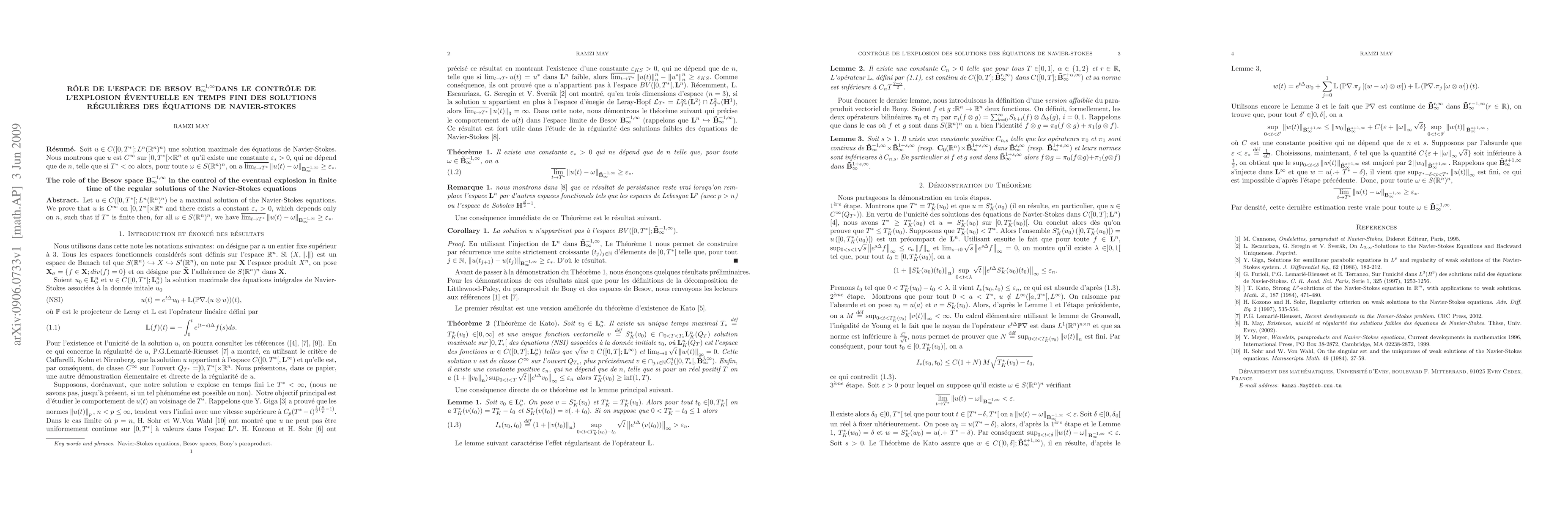 Let $u\in C([0,T^{\ast}[;L^{n}(\mathbb{R}% ^{n})^{n})$ be a maximal solution of the Navier-Stokes equations. We prove that $u$ is $C^{\infty}$ on $]0,T^{\ast}[\times \mathbb{R}^{n}$ and there exists a constant $\varepsilon _{\ast}>0$, which depends only on $n,$ such that if $T^{\ast}$ is finite then, for all $\omega \in S(\mathbb{R}% ^{n})^{n},$ we have $\overline{\lim_{t\to T^{\ast}}}\Vert u(t)-\omega \Vert_{\mathbf{B}_{\infty}^{-1,\infty}}\geq \varepsilon_{\ast}.$