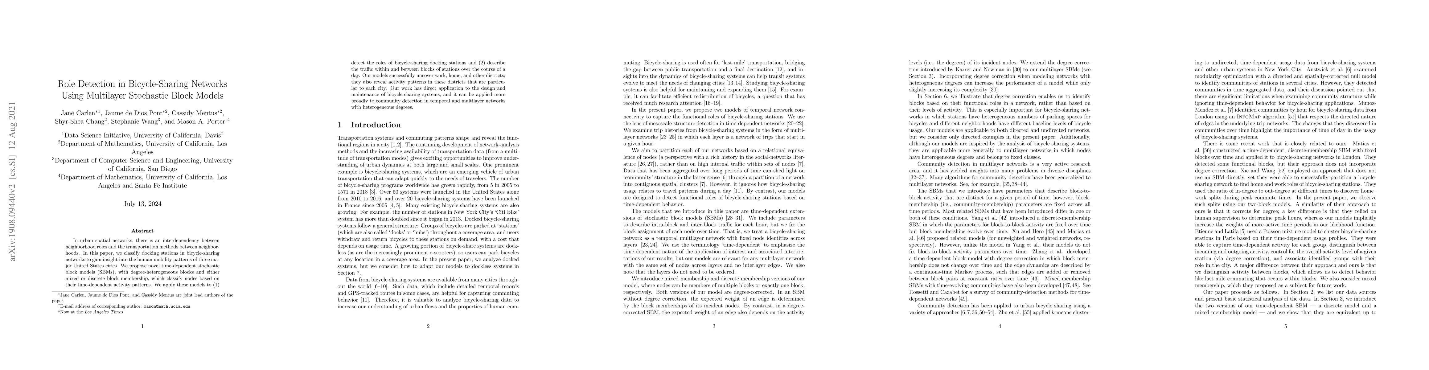 In urban spatial networks, there is an interdependency between neighborhood roles and the transportation methods between neighborhoods. In this paper, we classify docking stations in bicycle-sharing networks to gain insight into the human mobility patterns of three major United States cities. We propose novel time-dependent stochastic block models (SBMs), with degree-heterogeneous blocks and either mixed or discrete block membership, which classify nodes based on their time-dependent activity patterns. We apply these models to (1) detect the roles of bicycle-sharing docking stations and (2) describe the traffic within and between blocks of stations over the course of a day. Our models successfully uncover work, home, and other districts; they also reveal activity patterns in these districts that are particular to each city. Our work has direct application to the design and maintenance of bicycle-sharing systems, and it can be applied more broadly to community detection in temporal and multilayer networks with heterogeneous degrees.