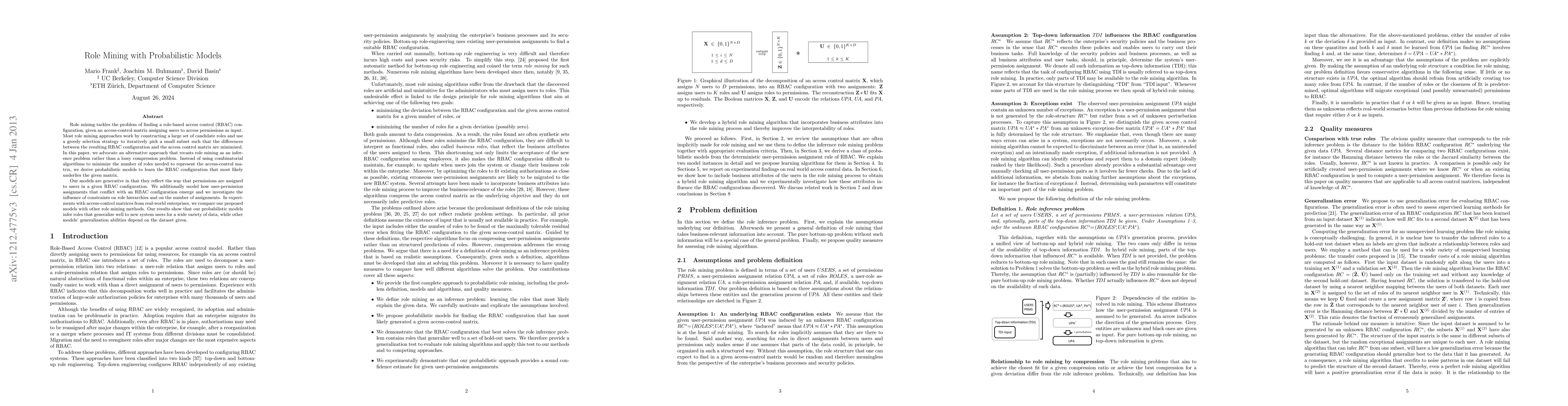 Role mining tackles the problem of finding a role-based access control (RBAC) configuration, given an access-control matrix assigning users to access permissions as input. Most role mining approaches work by constructing a large set of candidate roles and use a greedy selection strategy to iteratively pick a small subset such that the differences between the resulting RBAC configuration and the access control matrix are minimized. In this paper, we advocate an alternative approach that recasts role mining as an inference problem rather than a lossy compression problem. Instead of using combinatorial algorithms to minimize the number of roles needed to represent the access-control matrix, we derive probabilistic models to learn the RBAC configuration that most likely underlies the given matrix. Our models are generative in that they reflect the way that permissions are assigned to users in a given RBAC configuration. We additionally model how user-permission assignments that conflict with an RBAC configuration emerge and we investigate the influence of constraints on role hierarchies and on the number of assignments. In experiments with access-control matrices from real-world enterprises, we compare our proposed models with other role mining methods. Our results show that our probabilistic models infer roles that generalize well to new system users for a wide variety of data, while other models' generalization abilities depend on the dataset given.