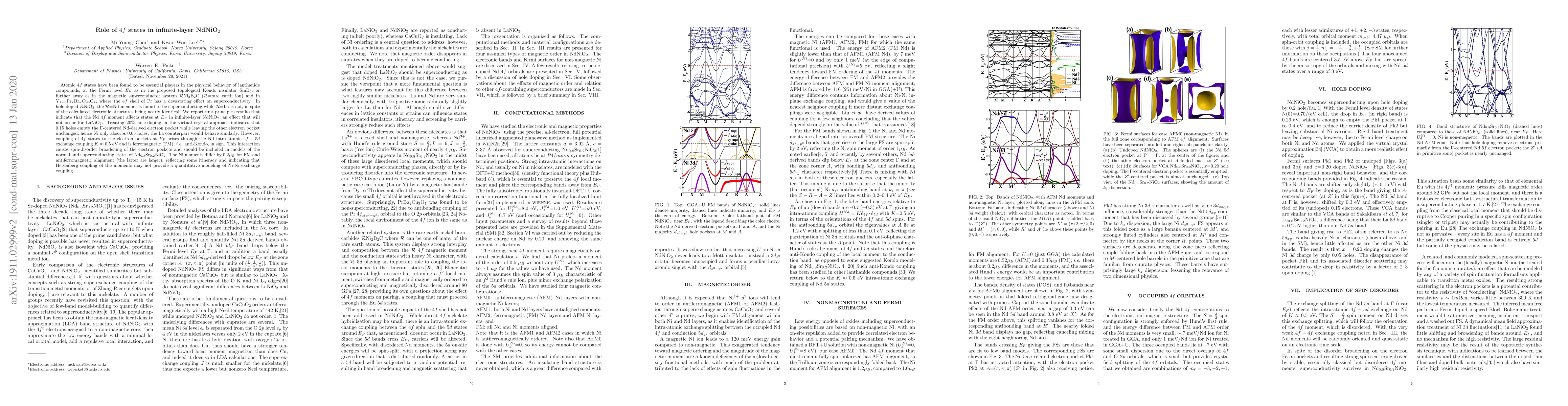 Atomic $4f$ states have been found to be essential players in the physical behavior of lanthanide compounds, at the Fermi level $E_F$ as in the proposed topological Kondo insulator SmB$_6$, or further away as in the magnetic superconductor system ${\cal R}$Ni$_2$B$_2$C (${\cal R}$=rare earth ion) and in Y$_{1-x}$Pr$_x$Ba$_2$Cu$_3$O$_7$, where the $4f$ shell of Pr has a devastating effect on superconductivity. In hole-doped ${\cal R}$NiO$_2$, the ${\cal R}$=Nd member is found to be superconducting while ${\cal R}$=La is not, in spite of the calculated electronic structures being nearly identical. We report first principles results that indicate that the Nd $4f$ moment affects states at $E_F$ in infinite-layer NdNiO$_2$, an effect that will not occur for LaNiO$_2$. Treating 20% hole-doping in the virtual crystal approach indicates that 0.15 holes empty the $\Gamma$-centered Nd-derived electron pocket while leaving the other electron pocket unchanged; hence Ni only absorbs 0.05 holes; the La counterpart would behave similarly. However, coupling of $4f$ states to the electron pockets at $E_F$ arises through the Nd intra-atomic $4f-5d$ exchange coupling $K\approx 0.5$ eV and is ferromagnetic (FM), i.e. anti-Kondo, in sign. This interaction causes spin-disorder broadening of the electron pockets and should be included in models of the normal and superconducting states of Nd$_{0.8}$Sr$_{0.2}$NiO$_2$ The Ni moments differ by 0.2$\mu_B$ for FM and antiferromagnetic alignment (the latter are larger), reflecting some itineracy and indicating that Heisenberg coupling of the moments may not provide a quantitative modeling of Ni-Ni exchange coupling.