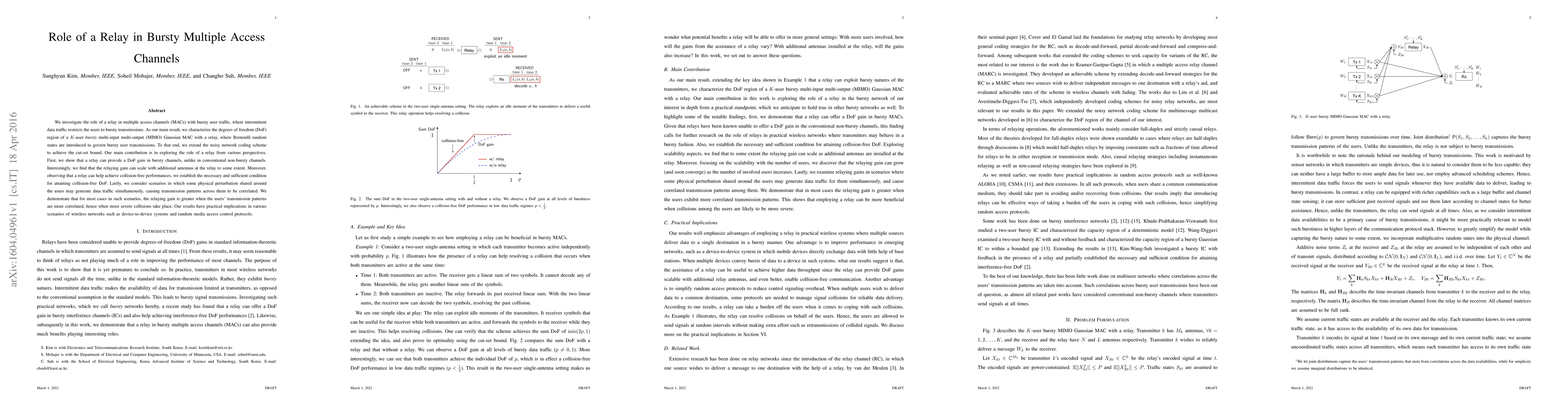 This paper explores the impact of a relay on the degrees of freedom (DoF) in bursty multiple access channels (MACs) with MIMO systems, showing that a relay can provide a DoF gain in bursty conditions, unlike in conventional non-bursty channels. The study also establishes conditions for collision-free performance and finds that relaying gain is greater when user transmission patterns are more correlated.