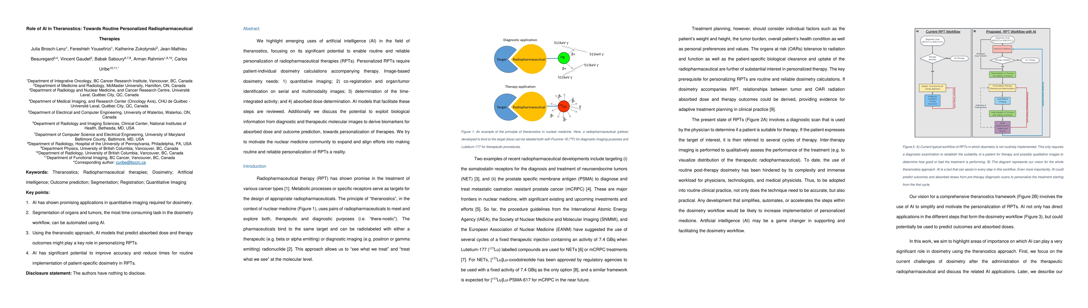 We highlight emerging uses of artificial intelligence (AI) in the field of theranostics, focusing on its significant potential to enable routine and reliable personalization of radiopharmaceutical therapies (RPTs). Personalized RPTs require patient-individual dosimetry calculations accompanying therapy. Image-based dosimetry needs: 1) quantitative imaging; 2) co-registration and organ/tumor identification on serial and multimodality images; 3) determination of the time-integrated activity; and 4) absorbed dose determination. AI models that facilitate these steps are reviewed. Additionally we discuss the potential to exploit biological information from diagnostic and therapeutic molecular images to derive biomarkers for absorbed dose and outcome prediction, towards personalization of therapies. We try to motivate the nuclear medicine community to expand and align efforts into making routine and reliable personalization of RPTs a reality.